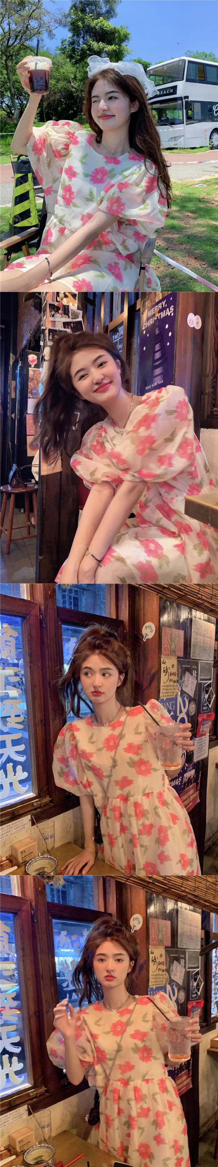 age-reducing broken flower puff sleeve dress female summer 2022 new sweet loose fluffy princess dress 大人ガーリー スウィート キュート カジュアル ふわふわ サマー 夏物 フラワーデザイン 0921911421926259