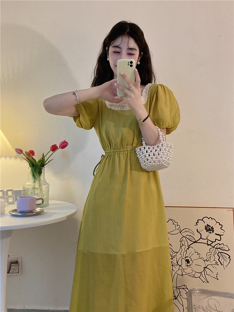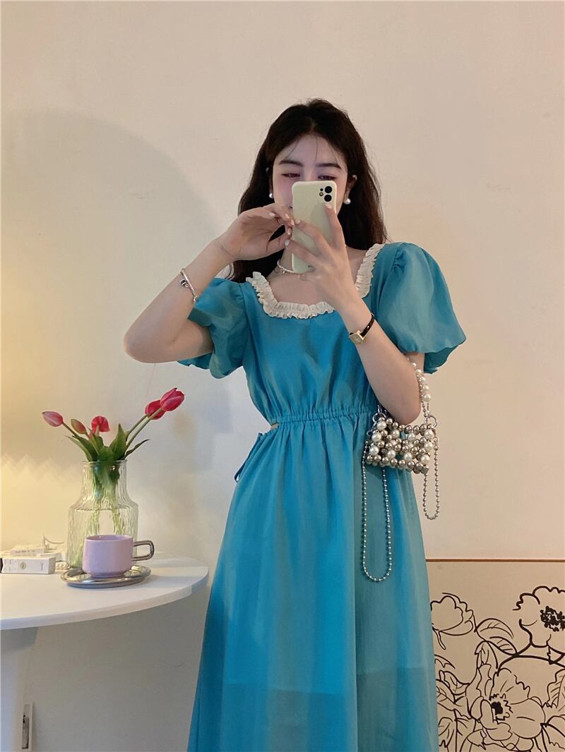 French blue lace square neck dress women's summer 2022 new drawstring hollow waist mid-length a-line skirt ブルー レース サマー 夏物 スカート Aライン スクウェア 0921930695569524