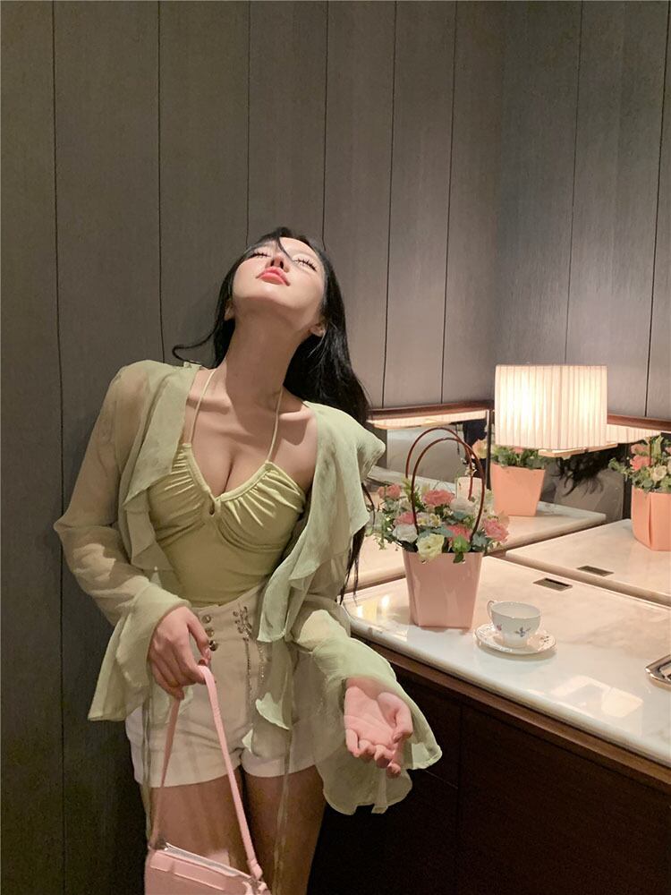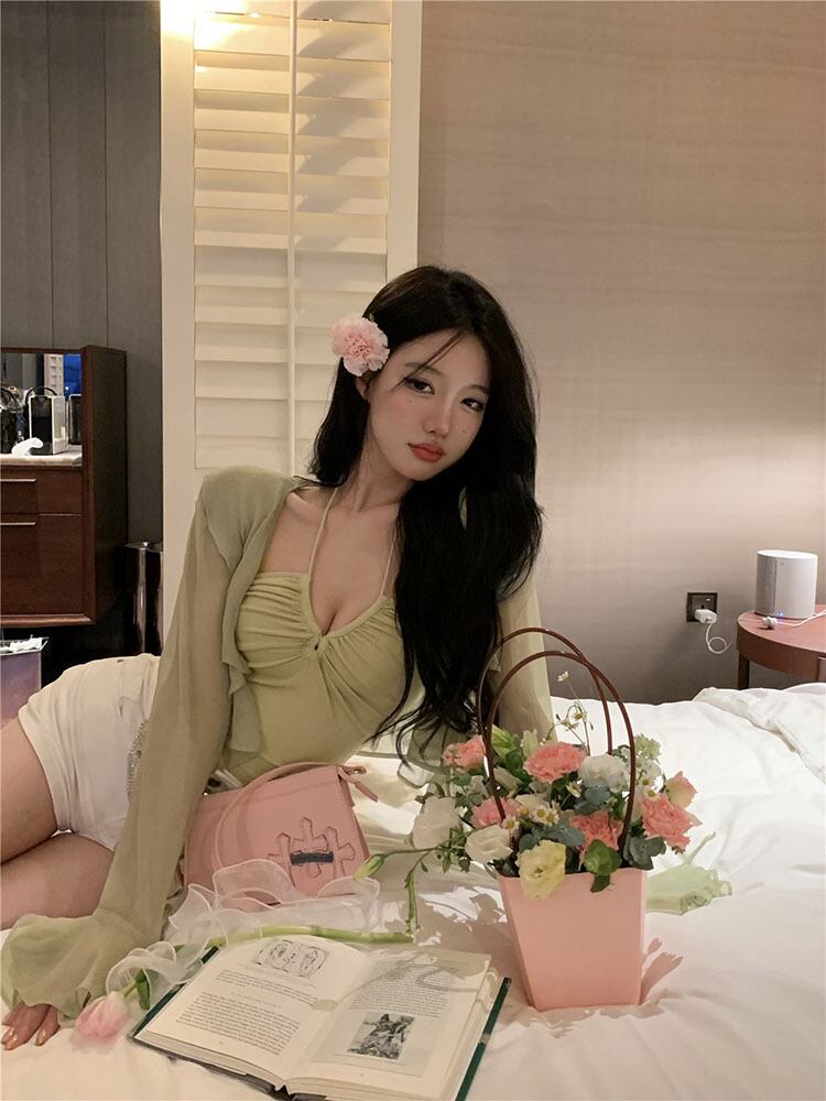 色:ライトグリーンcardigan,ライトグリーンtubeトップ,Singlepieceofホワイトshorts