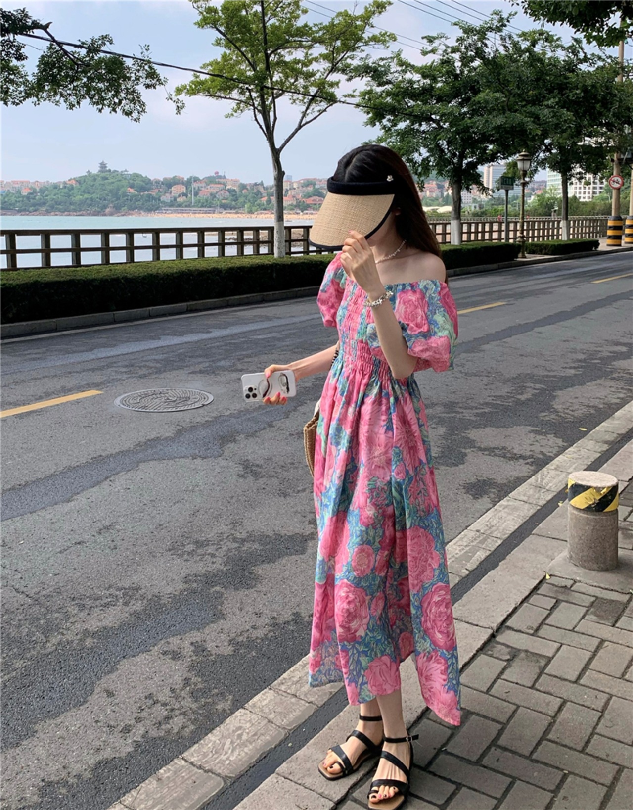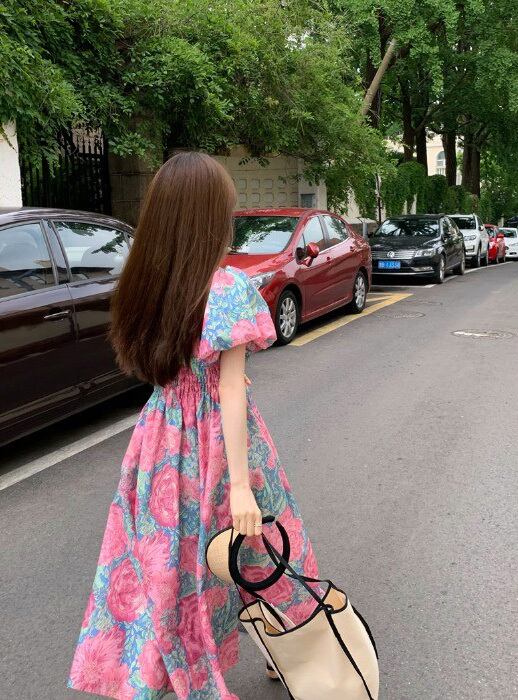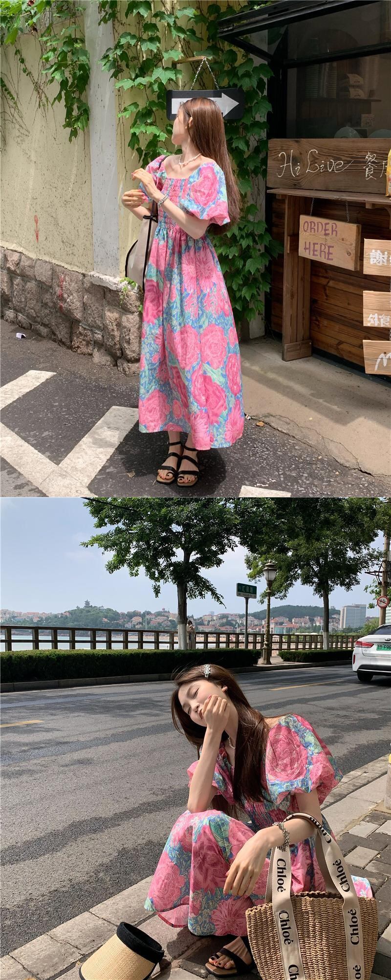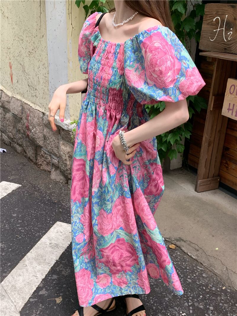 French holiday style square neck puff sleeve dress women's summer 2022 new temperament waist mid-length A-line skirt サマー 夏物 スカート Aライン スクウェア 092193416543045