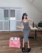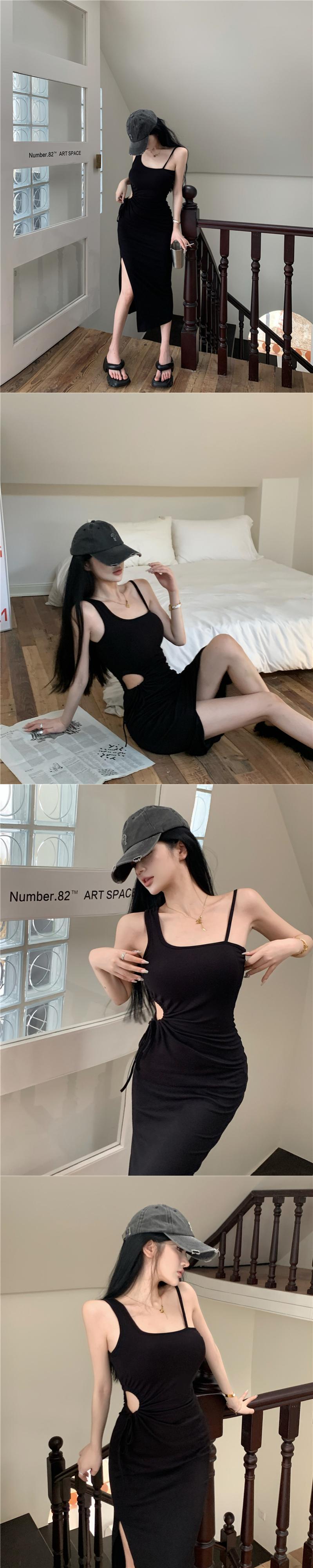 Sexy gray suspender dress female summer 2022 new style drawstring hollow waist mid-length slit bag hip skirt サマー 夏物 スカート 0921914291140436