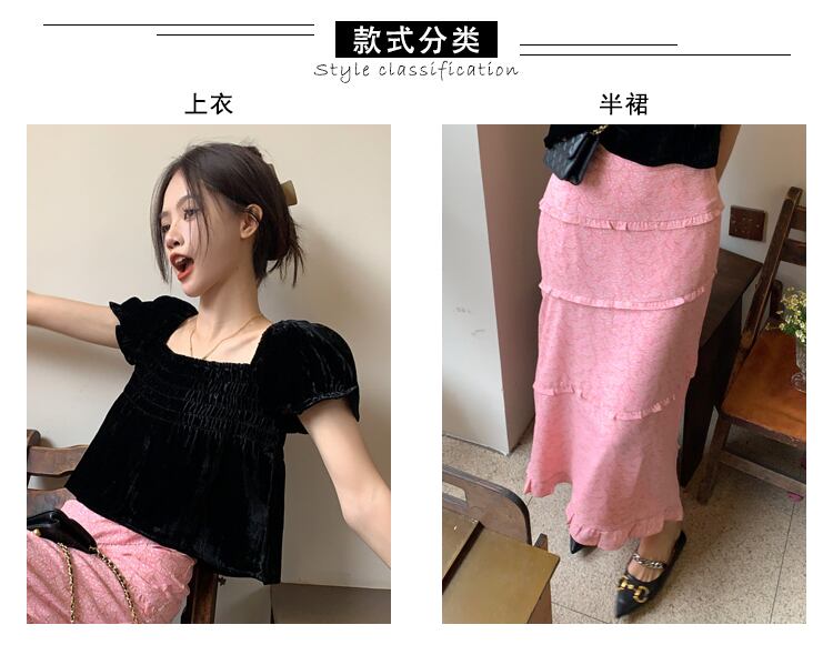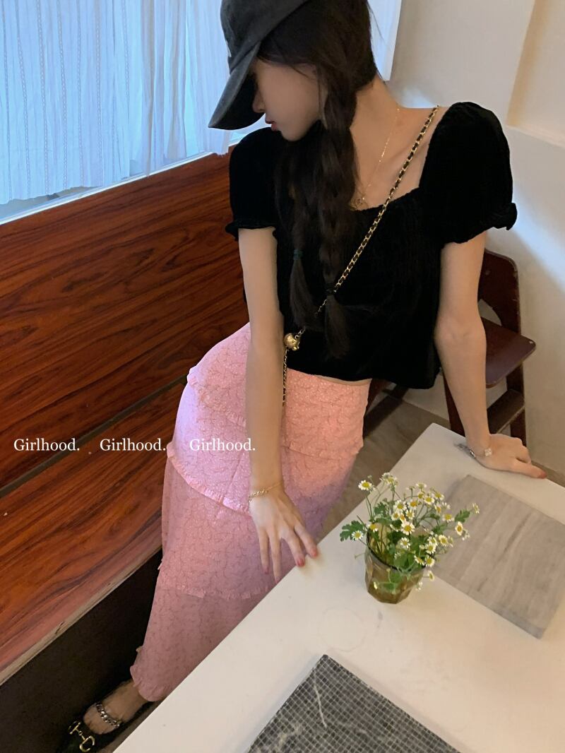 French retro square collar black velvet puff sleeve shirt women's summer 2022 new temperament thin short top ショート ブラック レトロ サマー 夏物 スクウェア 092194950372225