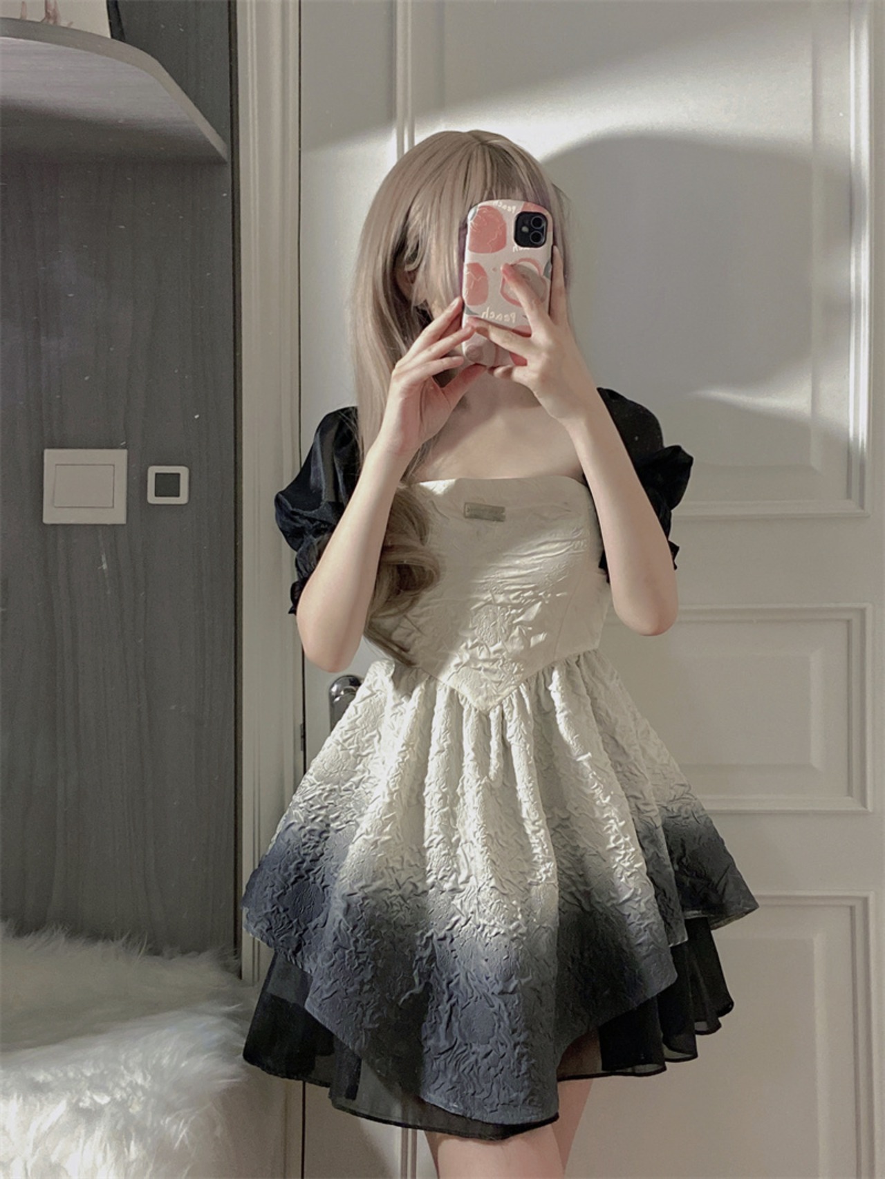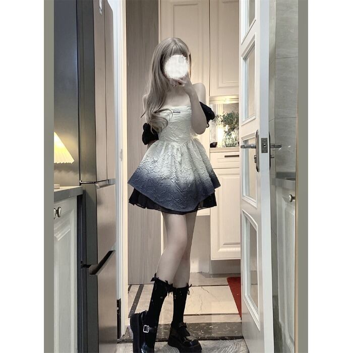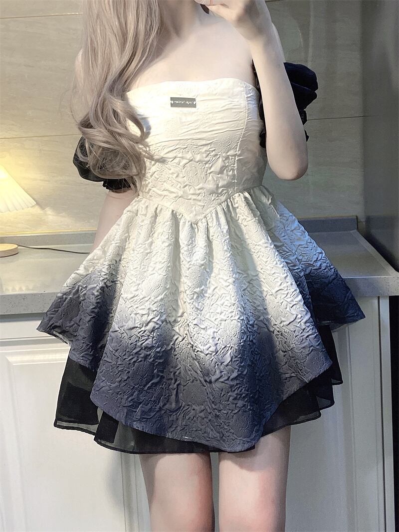 French square neck puff sleeve gradient dress female summer 2022 new waist mesh stitching puff skirt サマー 夏物 メッシュ スカート スクウェア ステッチ 0921997918351128