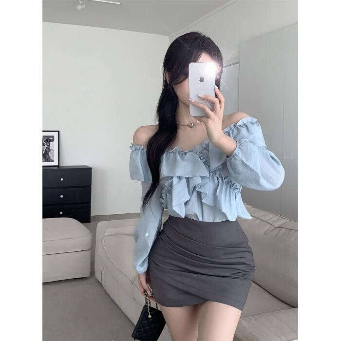 Gentle wind ruffled thin sunscreen shirt women's summer 2022 new design long-sleeved one-shoulder top trendy ロング サマー 夏物 0921976761631427