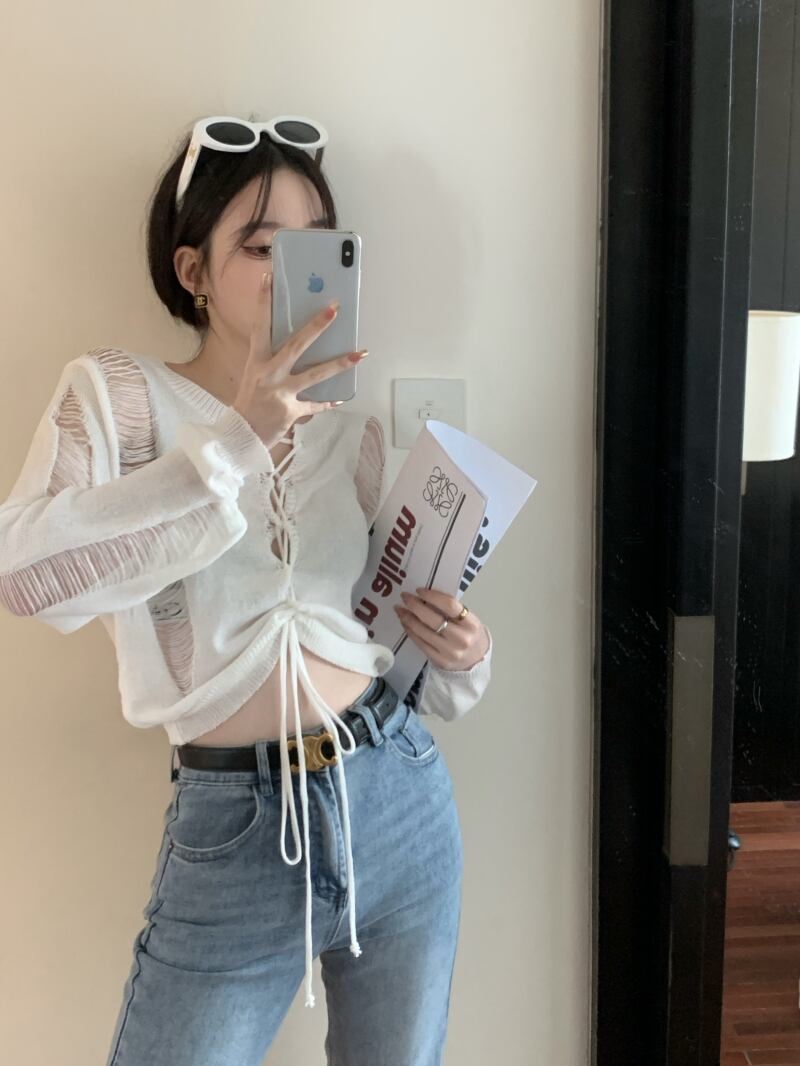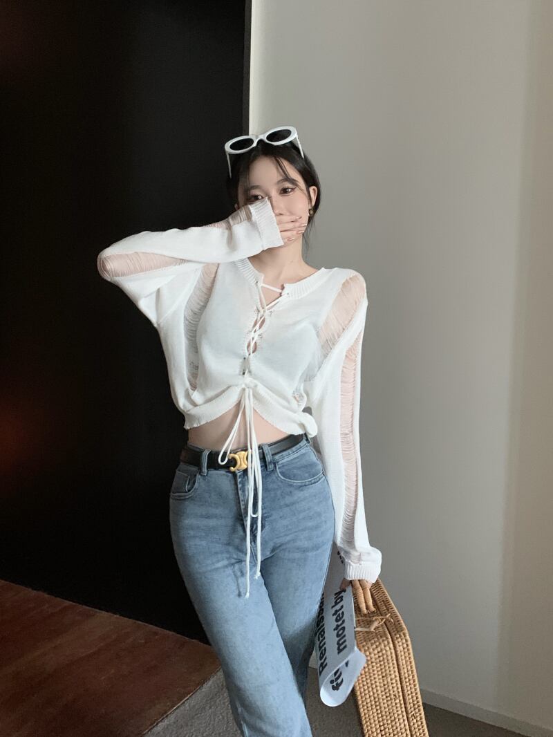 White thin sunscreen blouse ripped knitted sweater women's summer 2022 new chic bandage long-sleeved short top ショート ロング ホワイト ブラウス サマー 夏物 0921928170344578