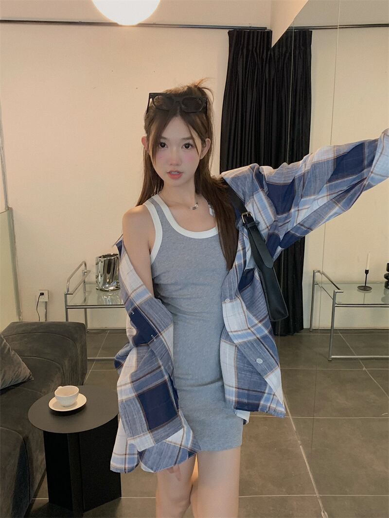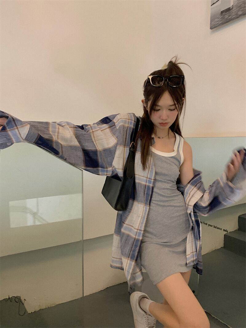Lazy wind contrast color plaid sunscreen shirt women's summer 2022 new design loose mid-length long-sleeved top ロング サマー 夏物 0921998142941783