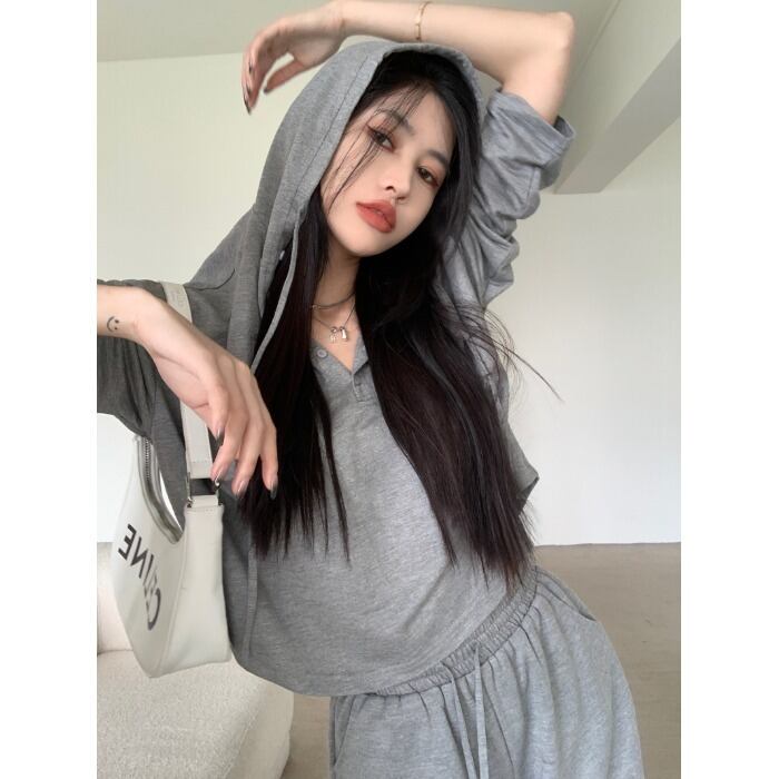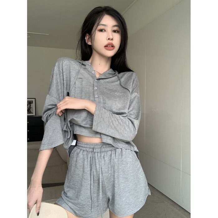 Grey sports suit female summer 2022 new long-sleeved hooded sunscreen top wide-leg shorts fashion two-piece suit ロング サマー 夏物 ショーツ ブルマー 0921943904997823
