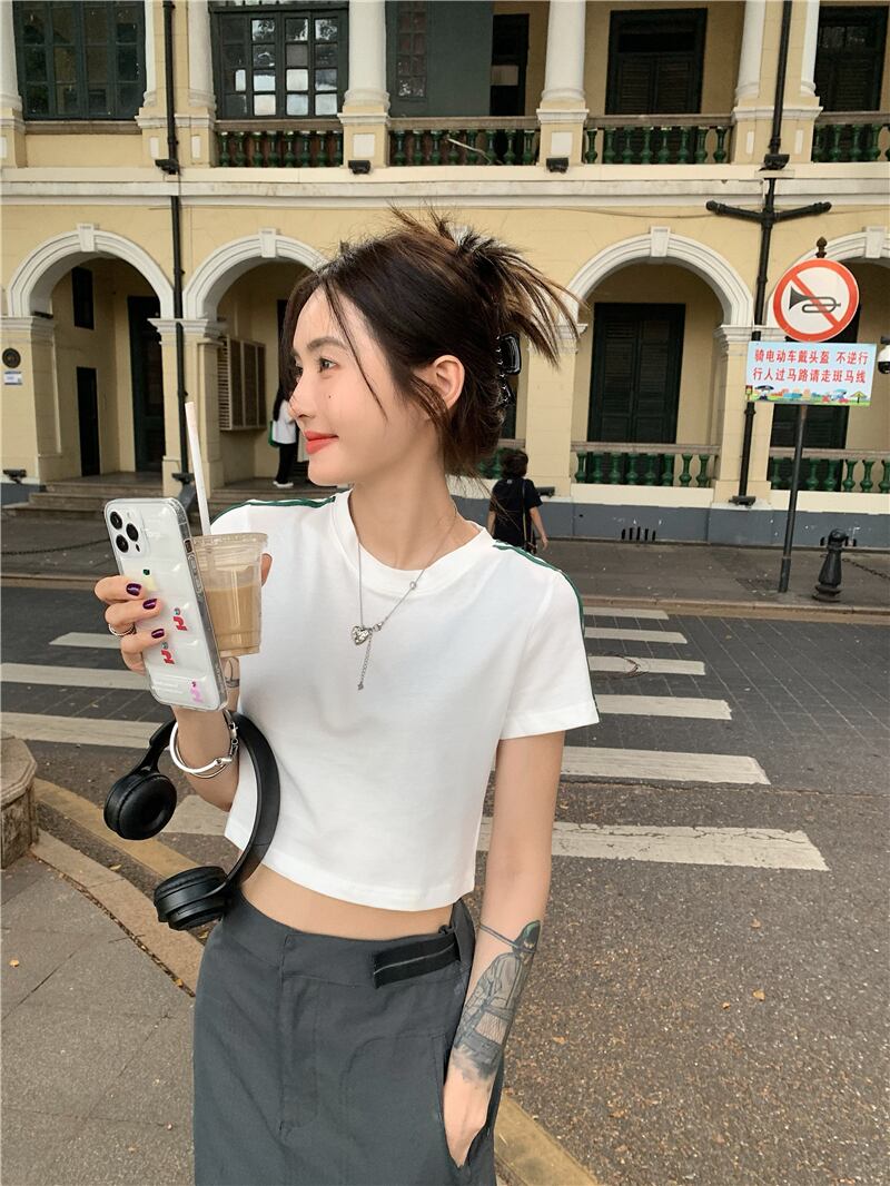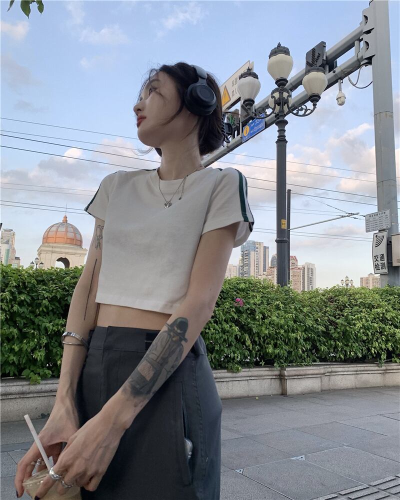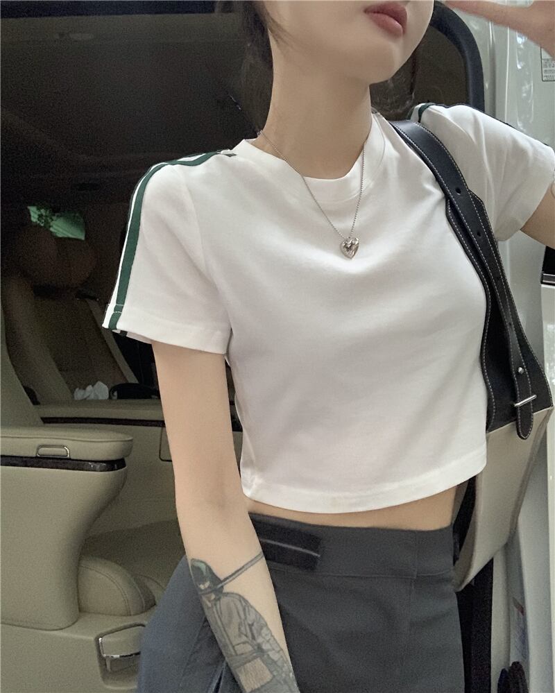 version all-match color striped T-shirt women's summer 2022 new eign style slim short section thin round neck top trendy ショート サマー 夏物 Oネック ストライプ スリム Tシャツ 0921913109434358