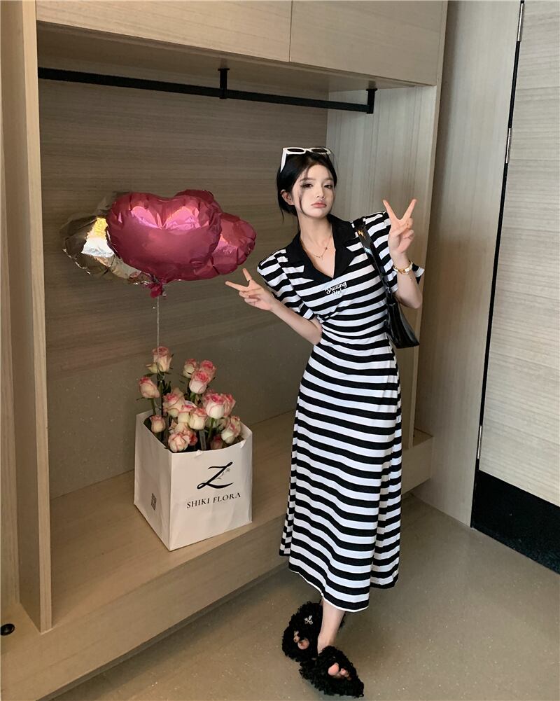 sense striped short-sleeved dress women's summer 2022 new style lazy wind waist mid-length slit skirt trendy サマー 夏物 スカート ストライプ 09219927928025