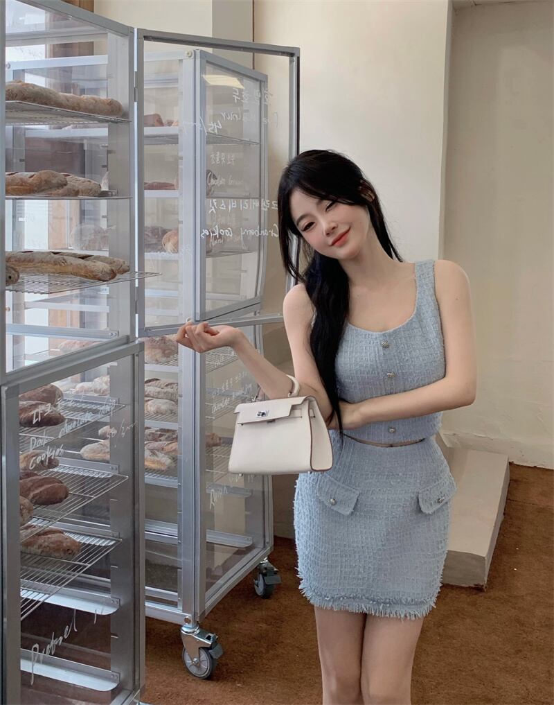 Blue small fragrance suit female summer 2022 new western style vest vest high waist skirt fashion two-piece set ハイウェスト ブルー サマー 夏物 スカート 0921965705113910