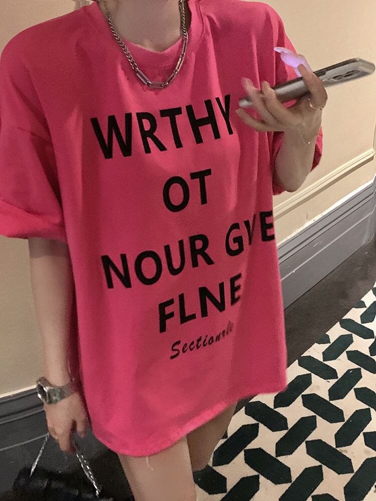 Rose red T-shirt women's summer 2022 new design small letter print loose all-match half-sleeve top trendy レッド サマー 夏物 Tシャツ 0921952059716514