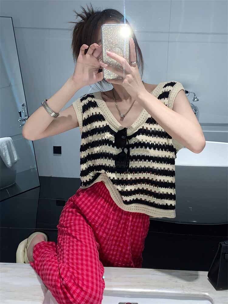 Net red hollow striped knitted vest women's outer wear trendy summer 2022 new version of the explosion style slimming all-match top レッド サマー 夏物 ストライプ 0921998702049140