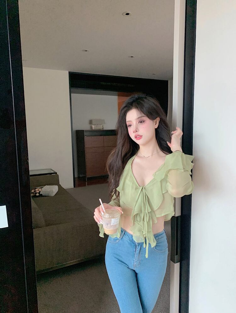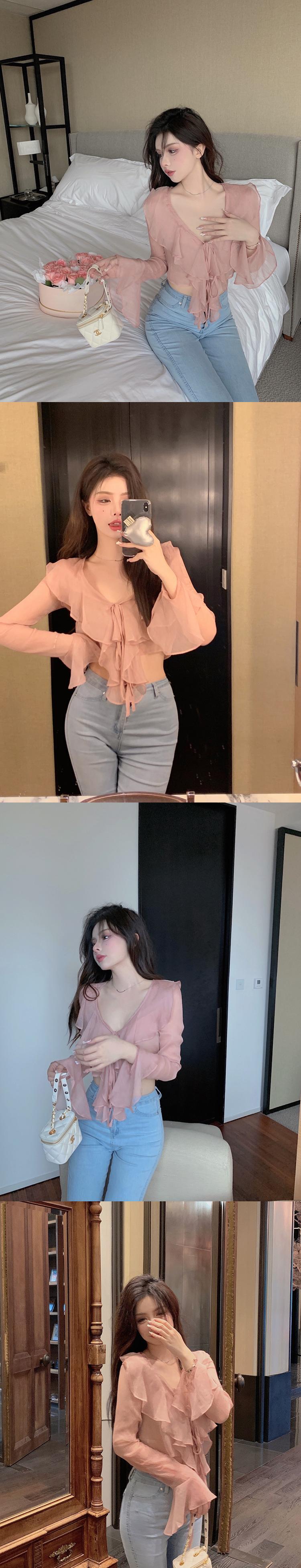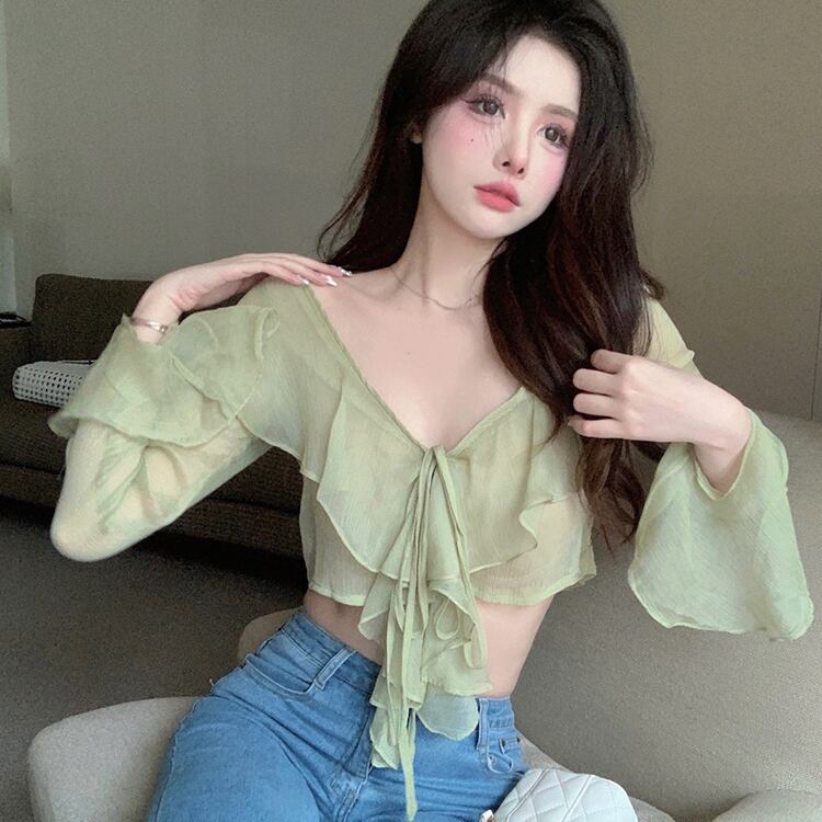 Pure desire wind V-neck ruffled lace trumpet sleeve chiffon shirt women's summer 2022 new temperament short top ins ショート シフォン レース サマー 夏物 Vネック 0921942736555546