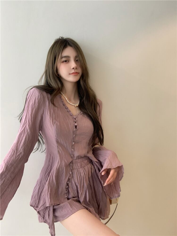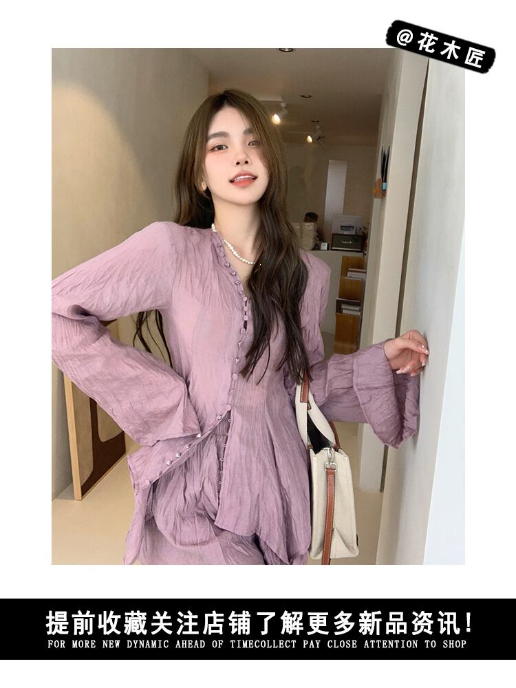 French purple sunscreen shirt women's summer 2022 new design sense niche slim pleated bell-sleeved top trendy プリーツ サマー 夏物 スリム パープル 0921980413708230