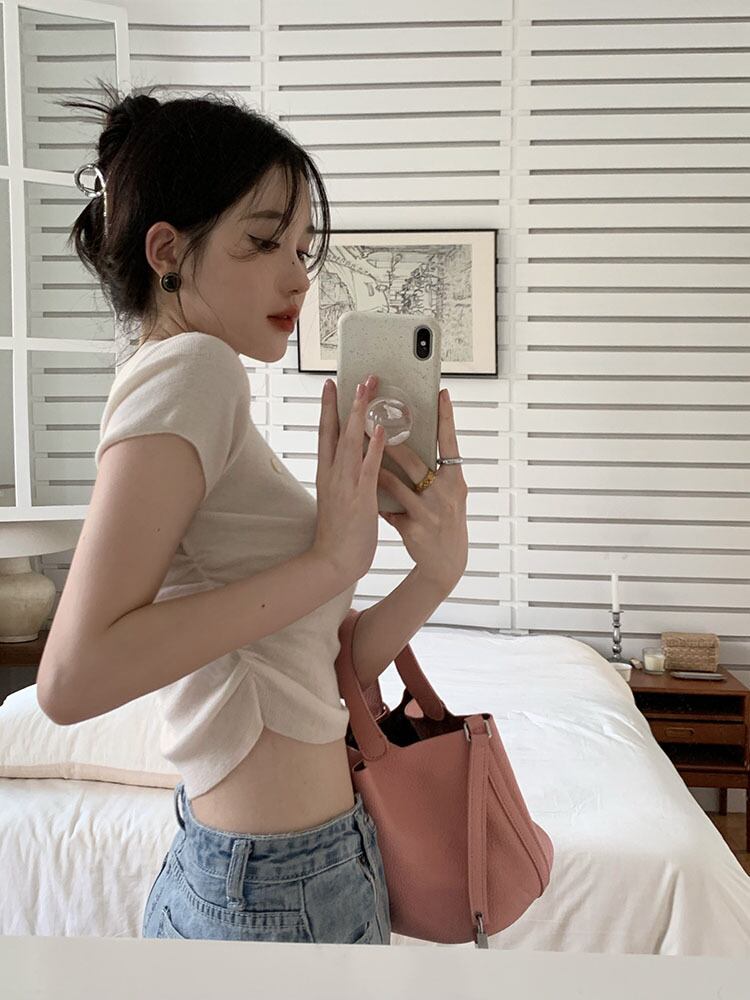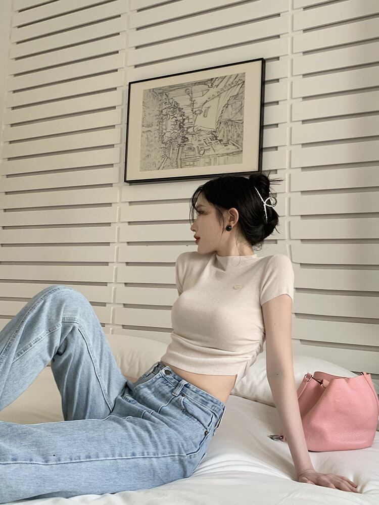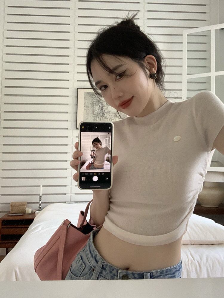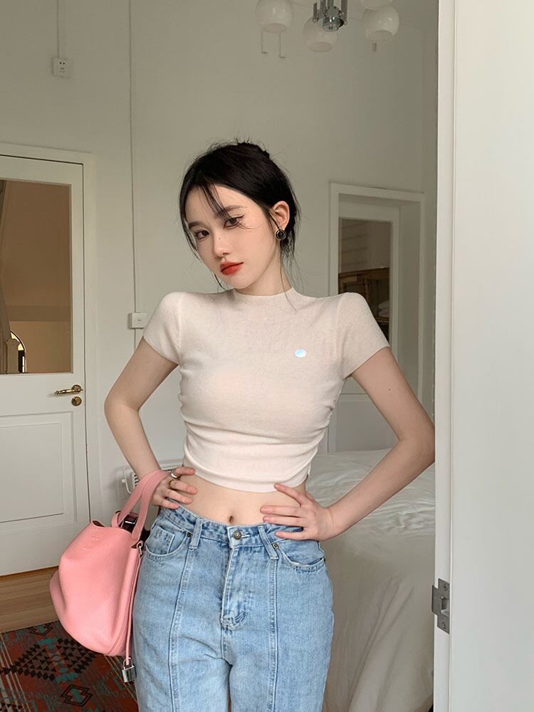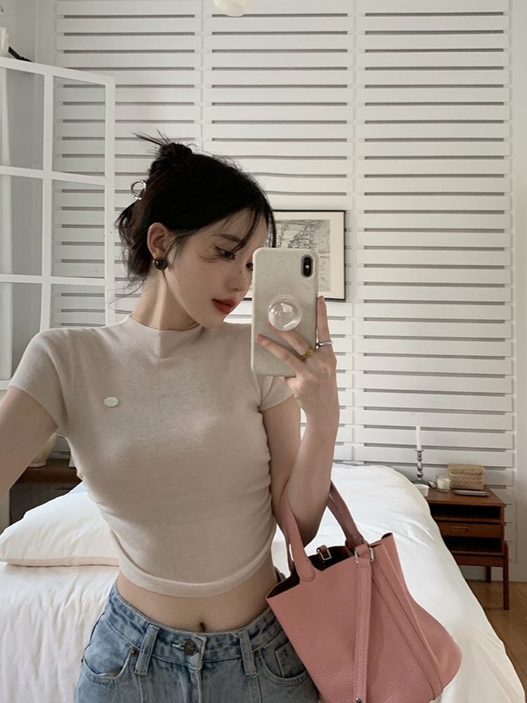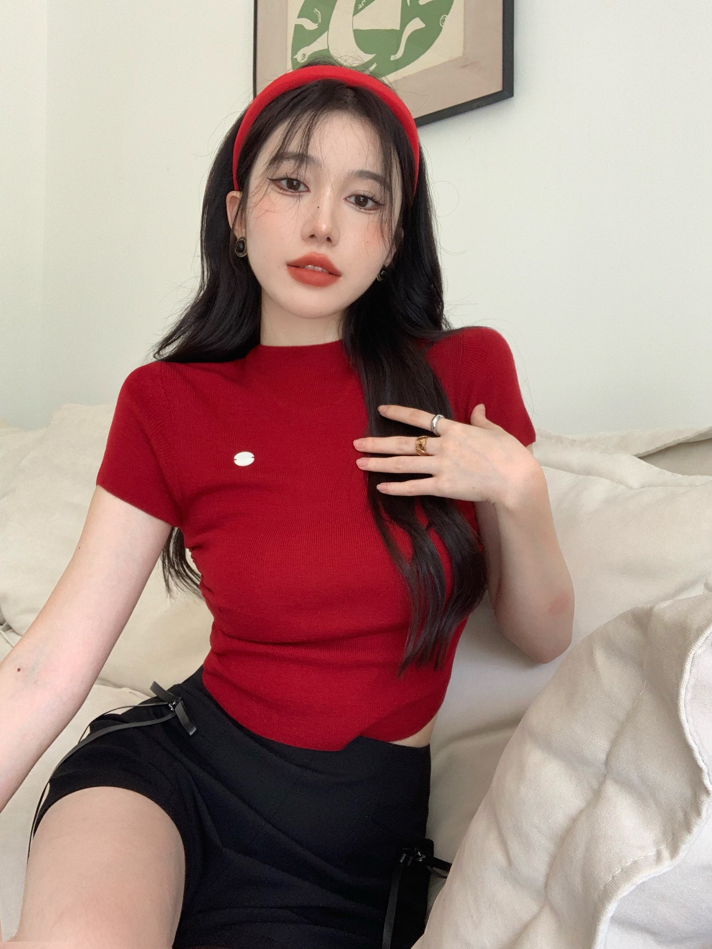 Hot red half turtleneck thin section short-sleeved T-shirt women's summer 2022 new temperament slim short knitted top ショート レッド サマー 夏物 スリム Tシャツ 092198516567649