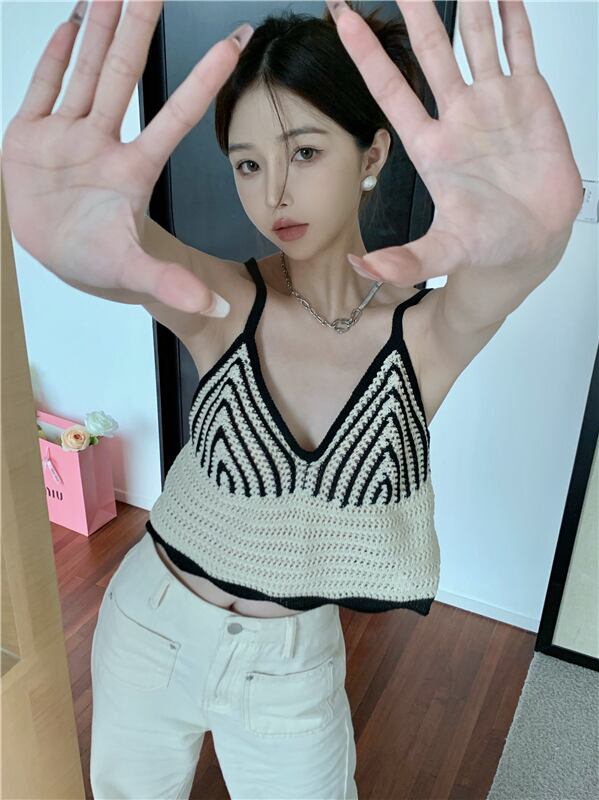 sense color matching woven small camisole women's outer wear summer 2022 new careful machine v-neck short top ショート サマー 夏物 Vネック 0921980902634668
