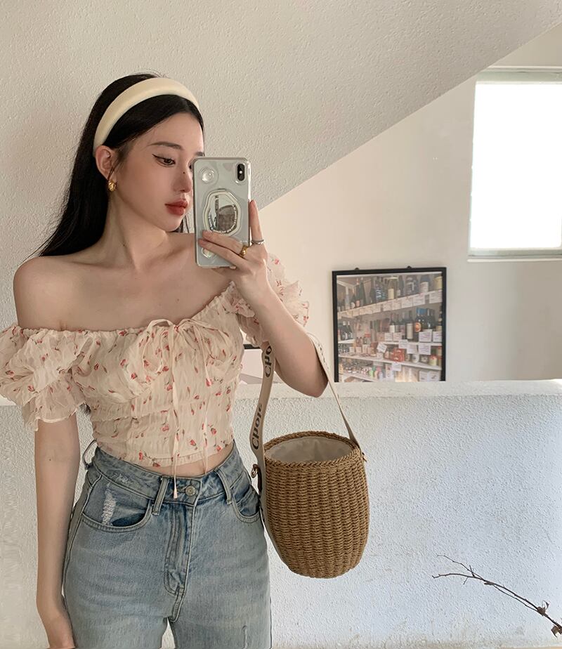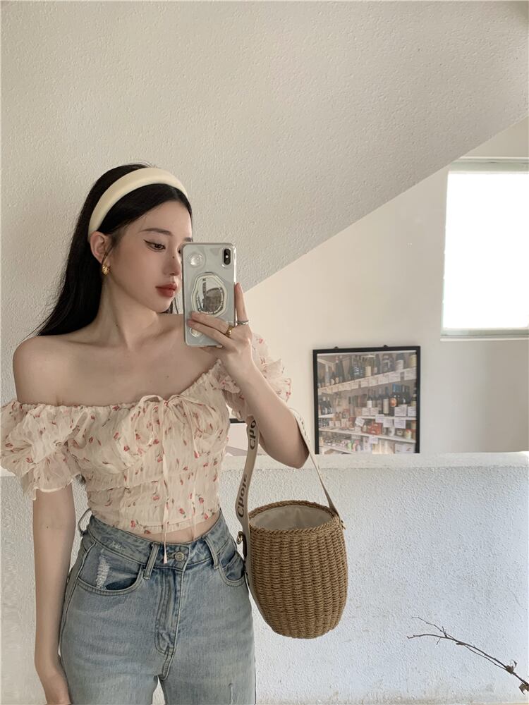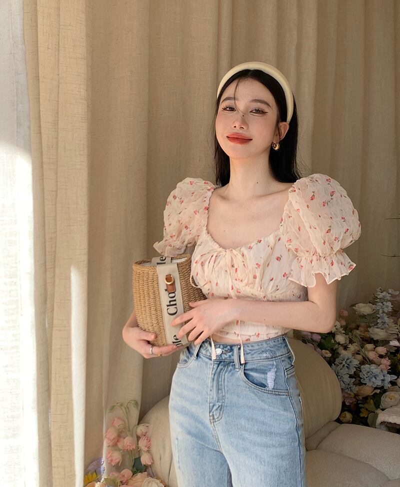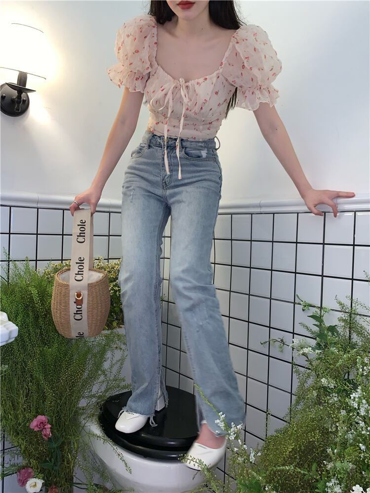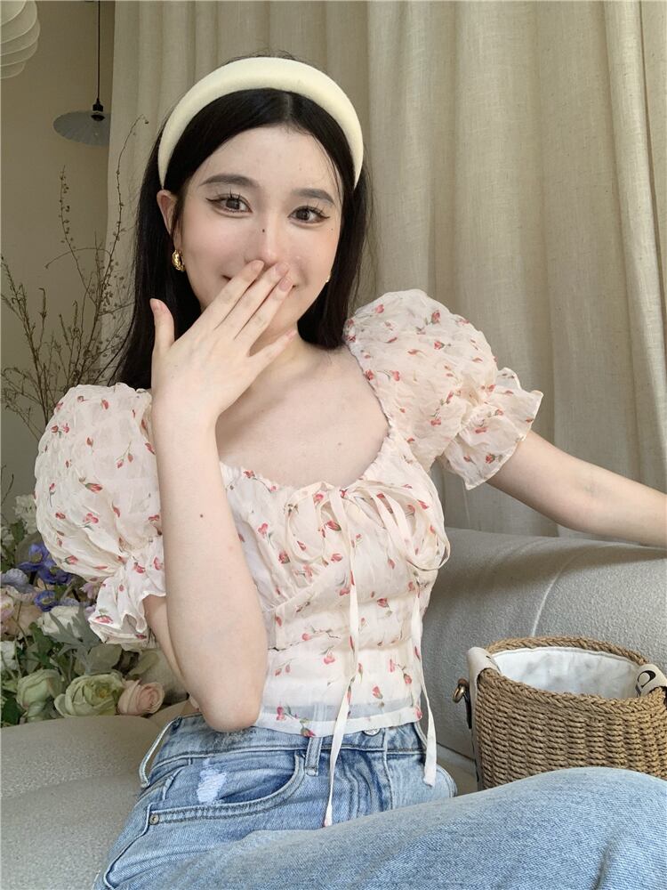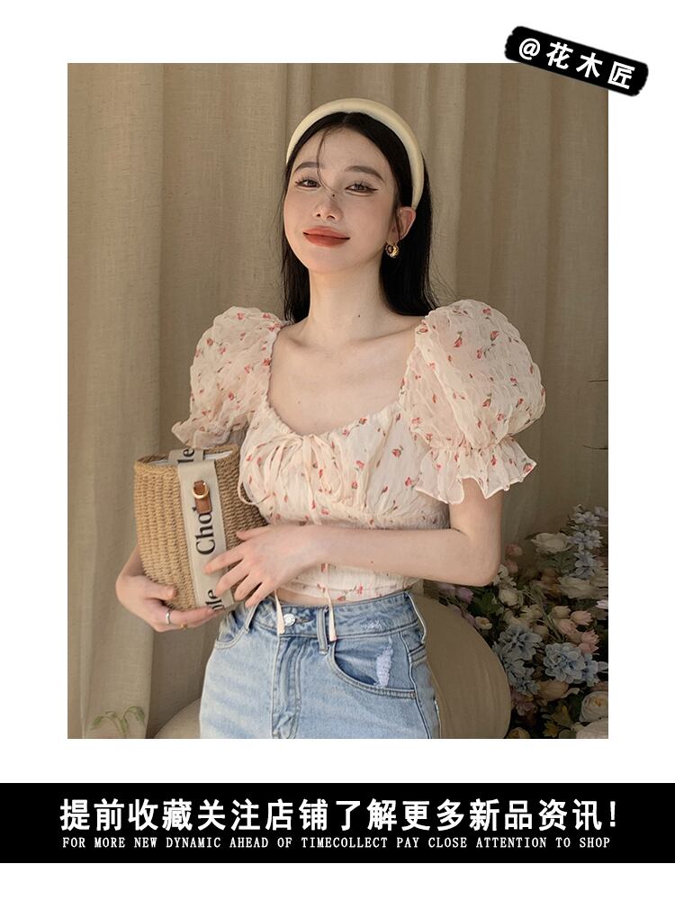 French sweet floral chiffon shirt women's summer 2022 new chic niche lace short puff sleeve top ショート シフォン レース 大人ガーリー スウィート キュート カジュアル サマー 夏物 花柄 0921996693241922