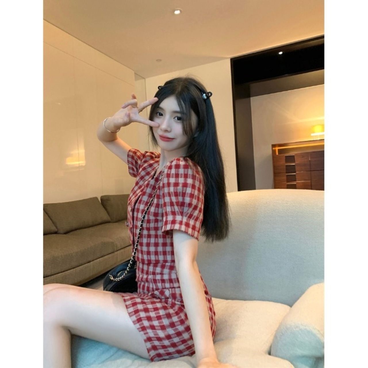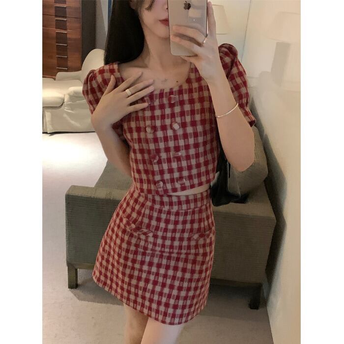 Sweet and cool chic plaid suit skirt women's summer 2022 new square collar top A-line skirt two-piece set 大人ガーリー スウィート キュート カジュアル サマー 夏物 スカート Aライン スクウェア 0921965073159018