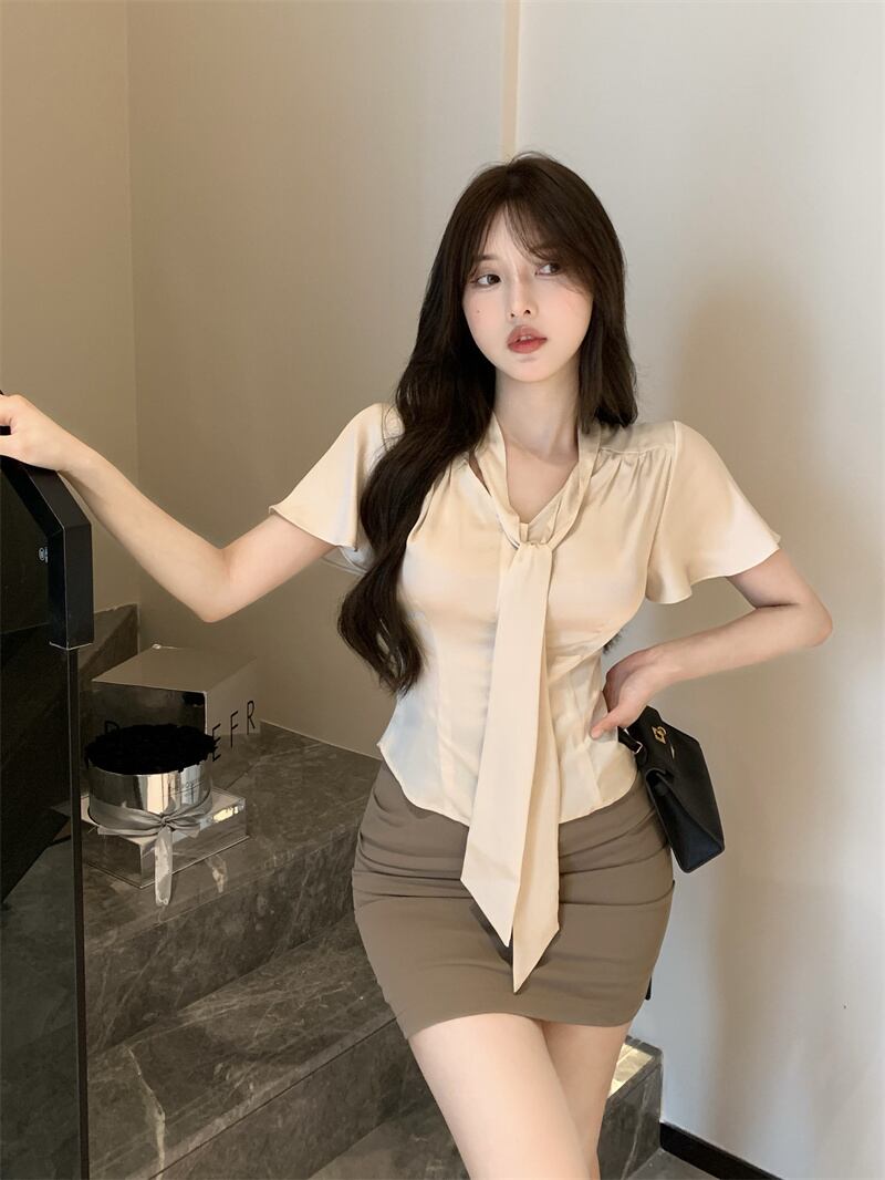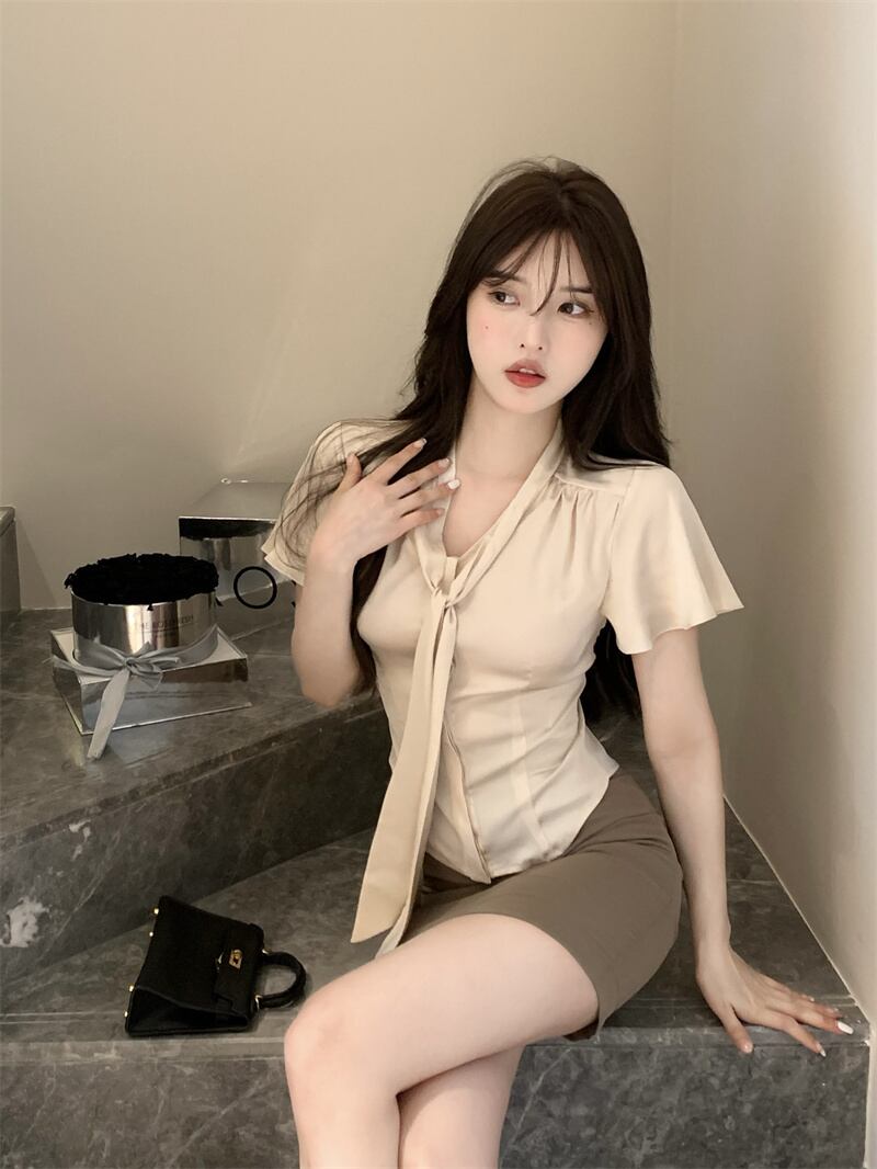 sense niche lace up short-sleeved shirt women's summer 2022 new French temperament slim slimming chic top レース サマー 夏物 スリム レースアップ 0921927794649860