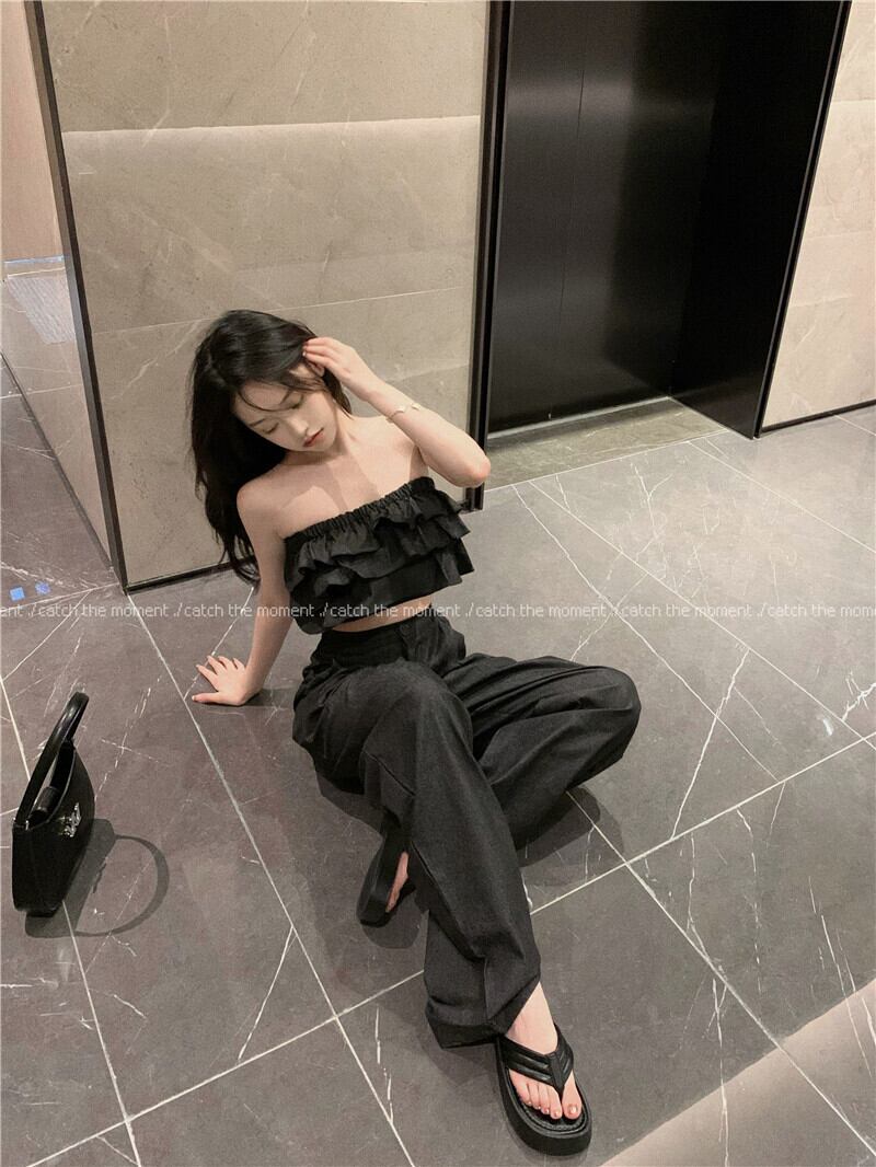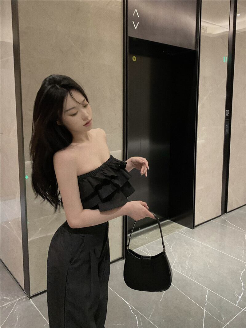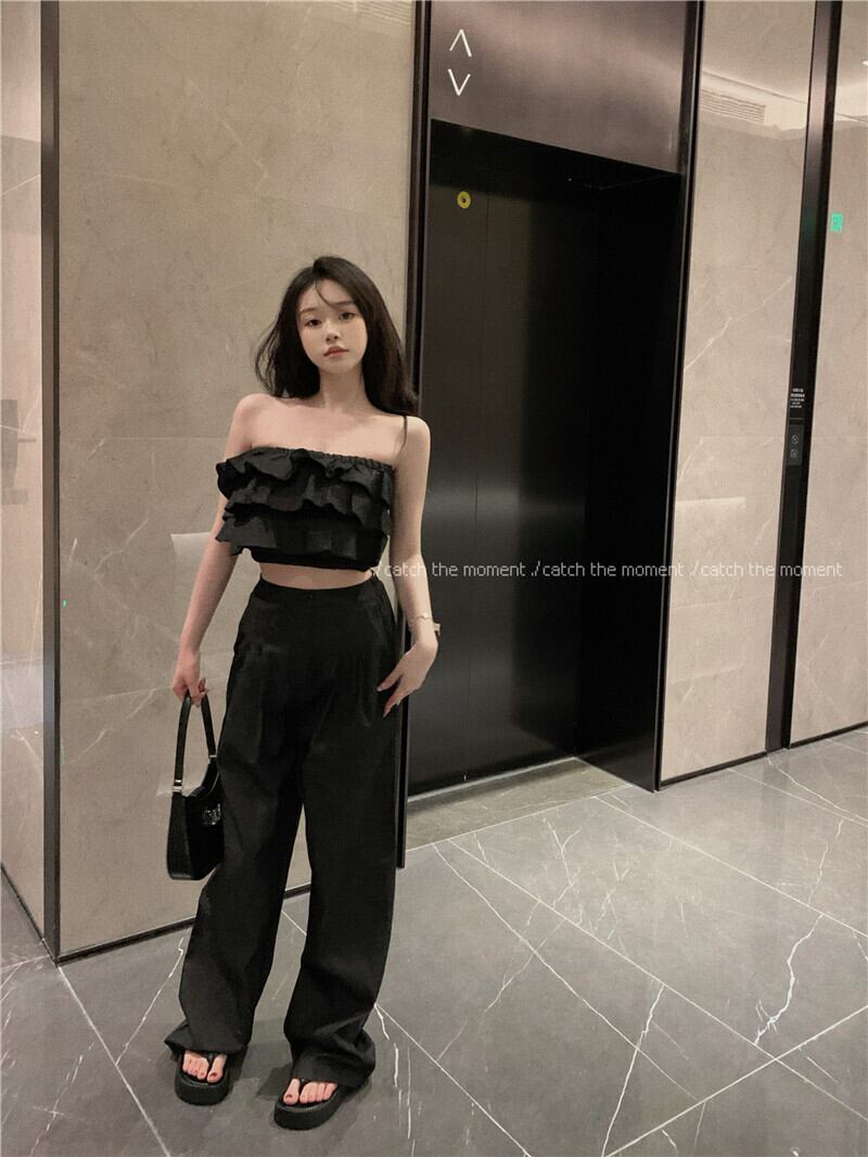 Black ruffled tube top top women's summer outer wear 2022 new design slim short strapless vest ショート ブラック サマー 夏物 スリム 0921982289535580