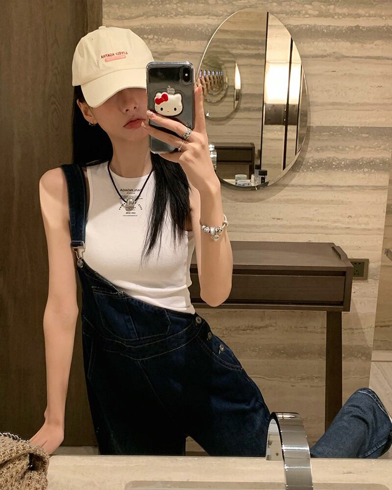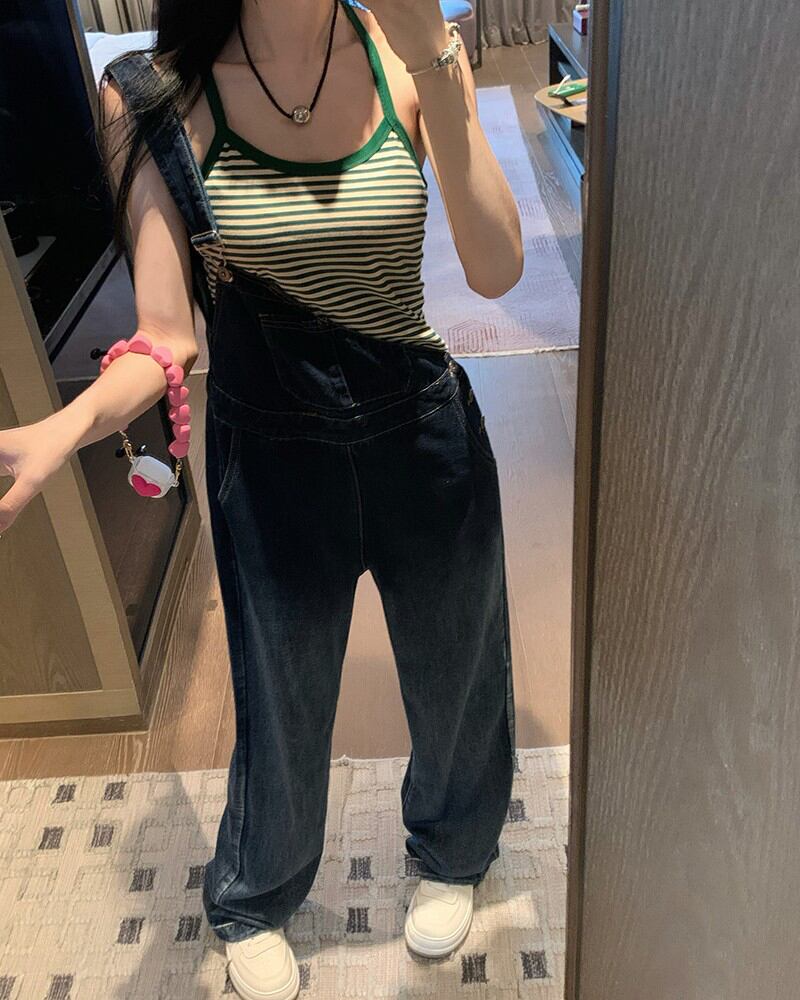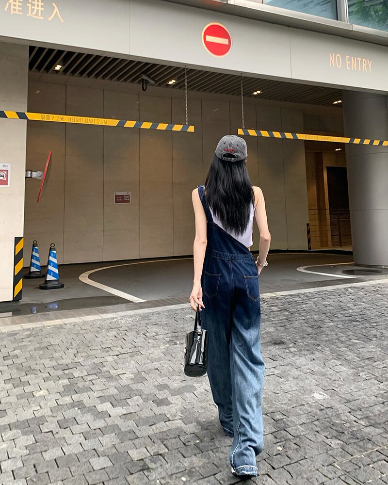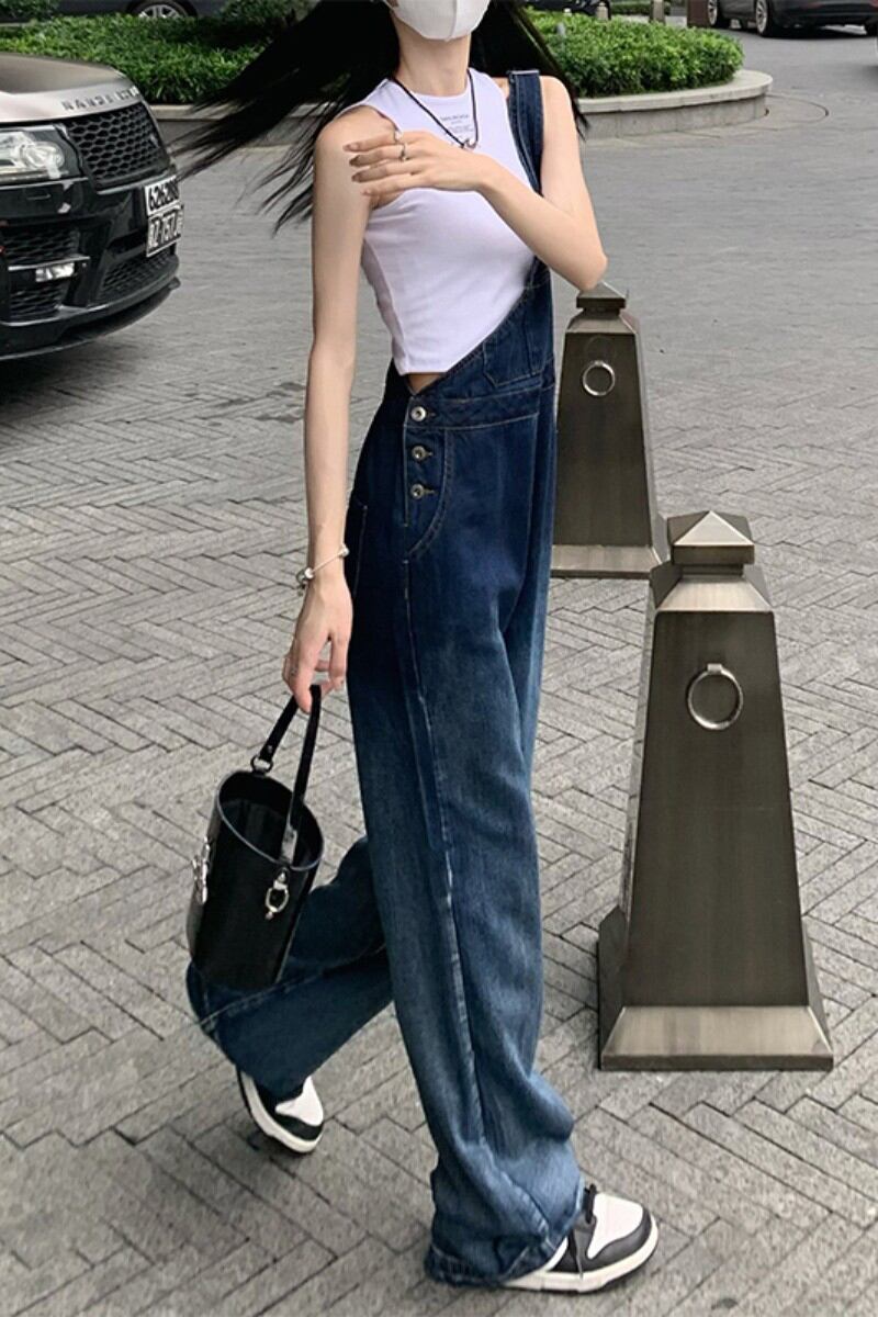 sense gradient color one-shoulder denim overalls women's summer 2022 new retro loose and thin wide-leg pants レトロ サマー 夏物 0921938734155454