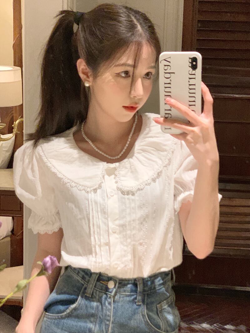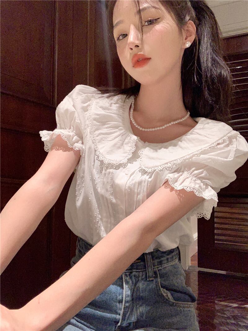 Pure desire wind sweet lace stitching doll collar white shirt women's summer 2022 new temperament thin top trendy ホワイト レース 大人ガーリー スウィート キュート カジュアル サマー 夏物 ステッチ 0921930835667717