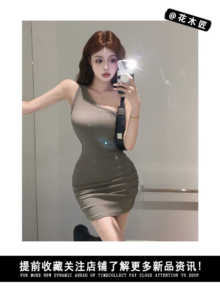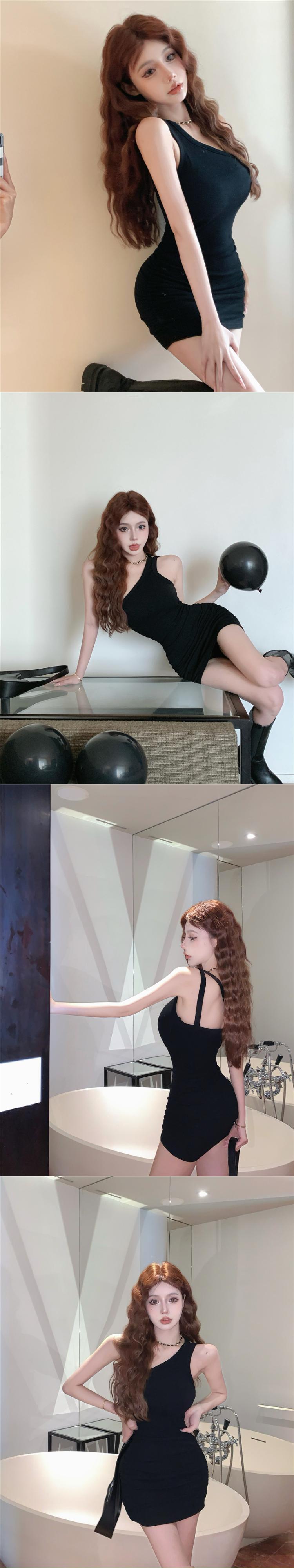 Hot backless temperament slanted shoulder dress women's summer 2022 new sexy pleated tight-fitting thin bag hip skirt プリーツ サマー 夏物 スカート 092196747432466