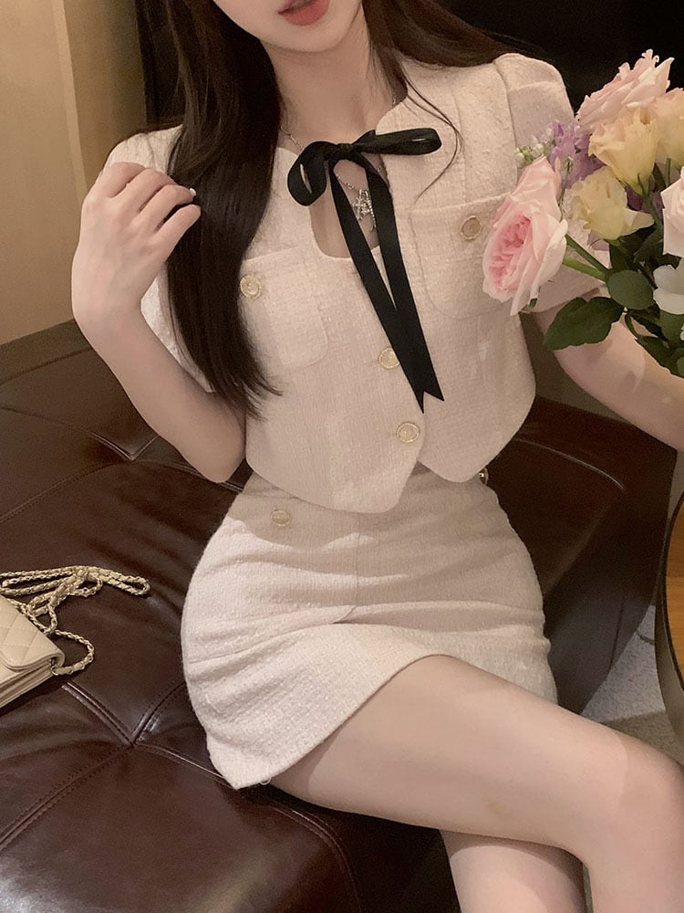 Celebrity tweed small fragrance suit female summer 2022 new temperament lace-up top package hip skirt two-piece set レース サマー 夏物 スカート レースアップ 0921974813276156