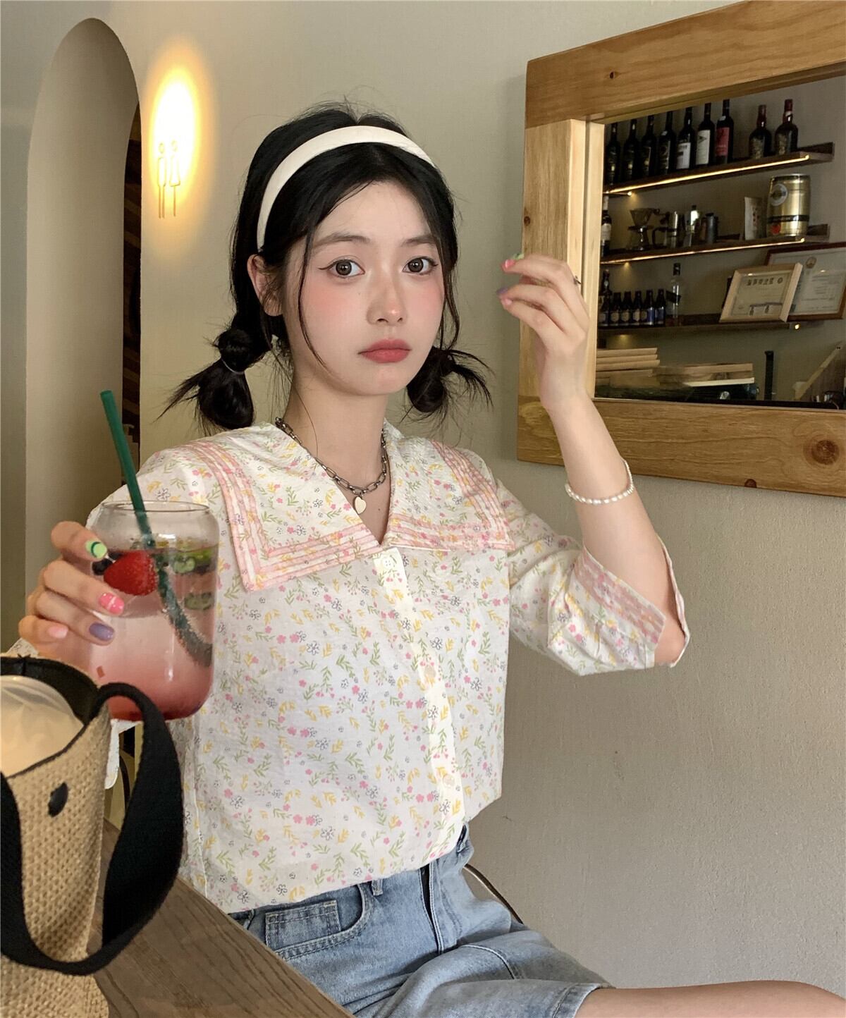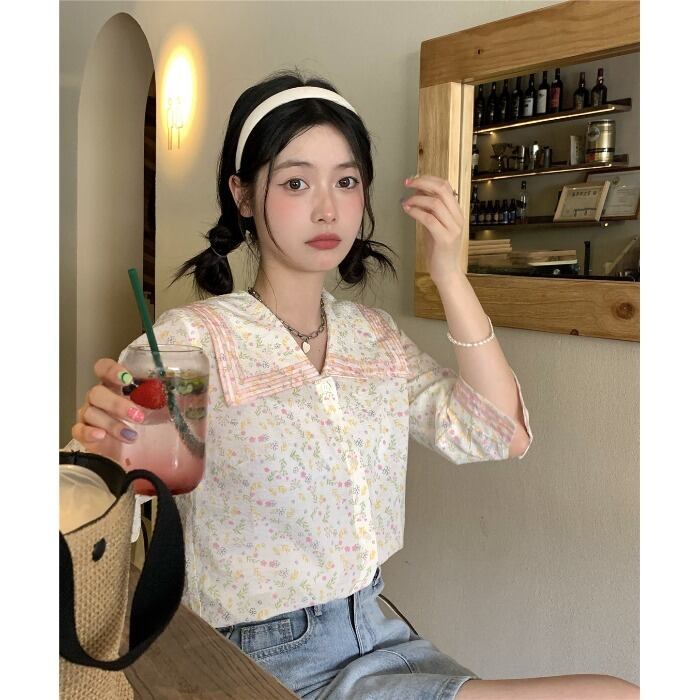 style small fresh floral navy collar shirt women's summer 2022 new niche three-quarter sleeve slim cardigan top カーディガン サマー 夏物 花柄 スリム 0921931468916102