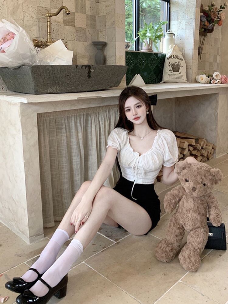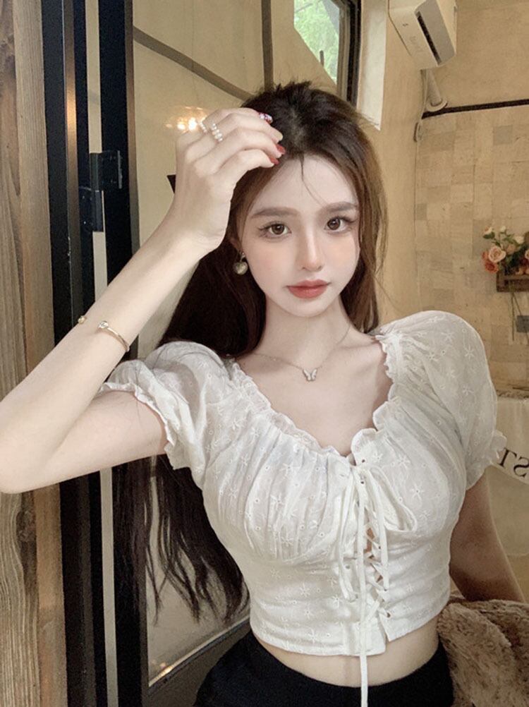 Pure desire temperament strap V-neck white shirt women's summer 2022 new French chic fungus edge short top ショート ホワイト サマー 夏物 Vネック 0921945804837425
