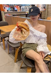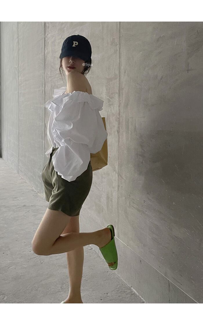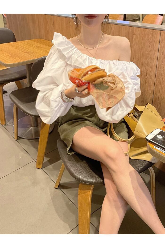 chic french slanted shoulder lantern sleeves white shirt women's summer 2022 new short loose design top ショート ホワイト ランタンスリーブ サマー 夏物 0921957356928103