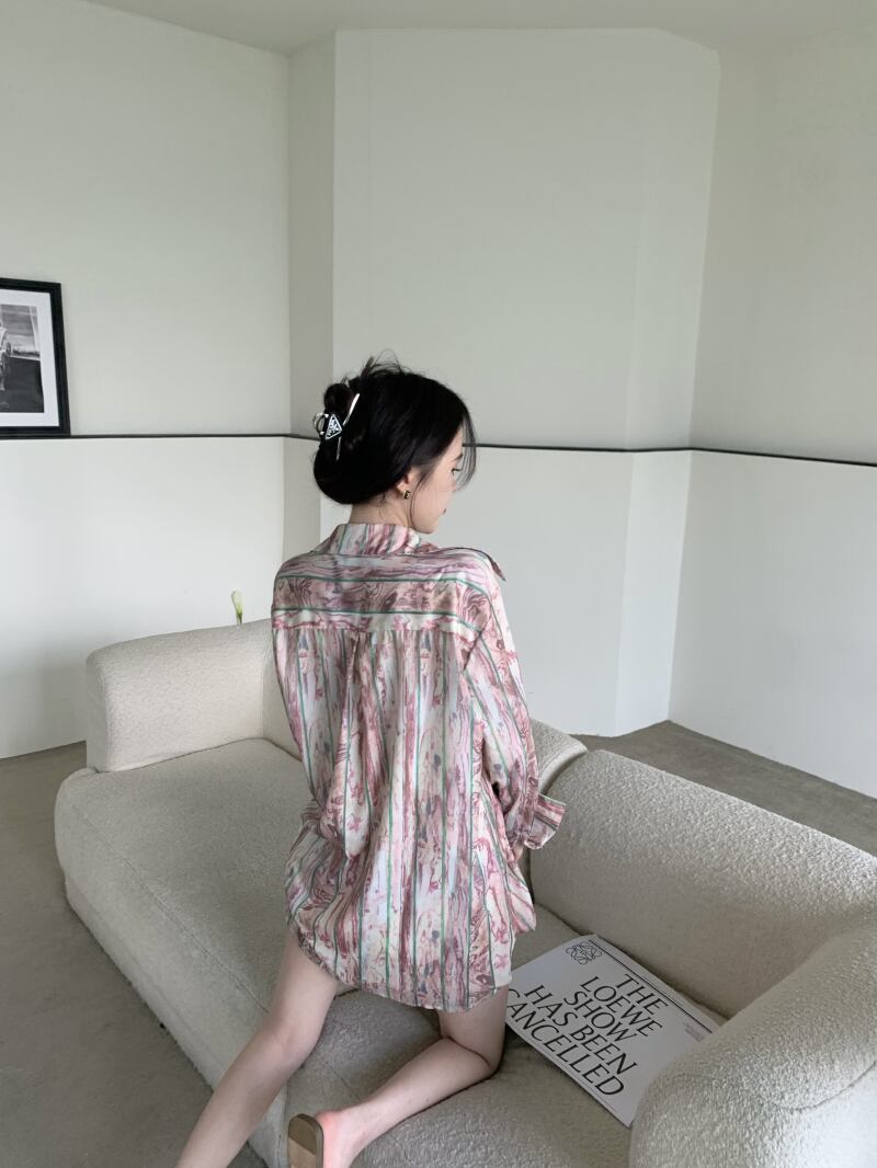Retro contrast color printing long-sleeved sunscreen shirt women's summer 2022 new loose design mid-length top trendy ロング レトロ サマー 夏物 0921954881478299