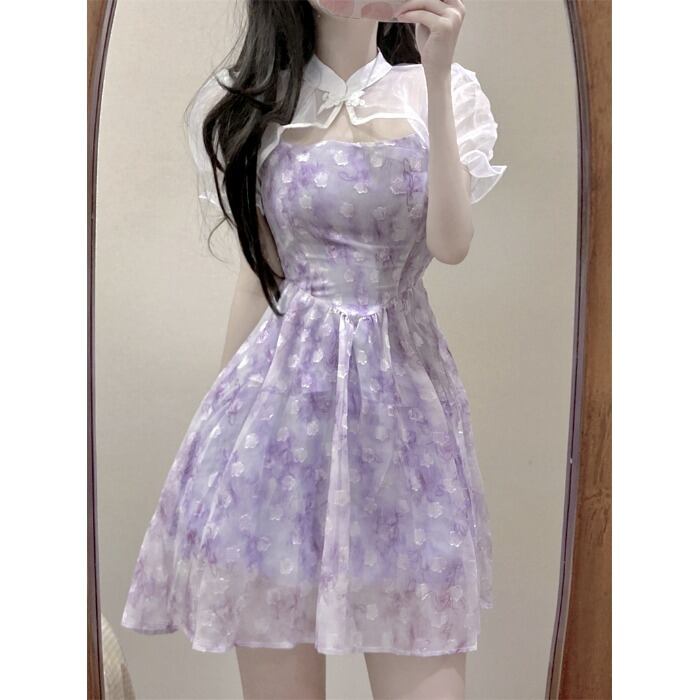 first love purple floral chiffon dress women's summer 2022 new gentle temperament waist A-line skirt ins シフォン サマー 夏物 花柄 スカート Aライン パープル 09219816391282