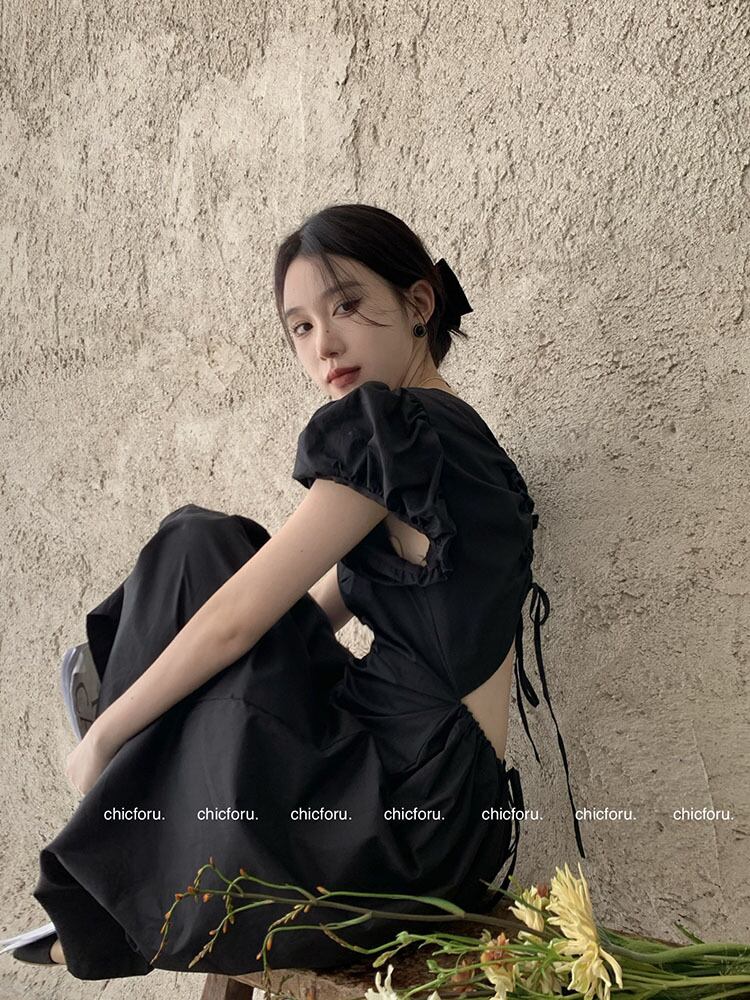 White Puff Sleeve Dress Women's Summer 2022 French Lace-up Hollow Waist Mid-Length A-Line Skirt ホワイト レース サマー 夏物 スカート Aライン レースアップ 092191856229519