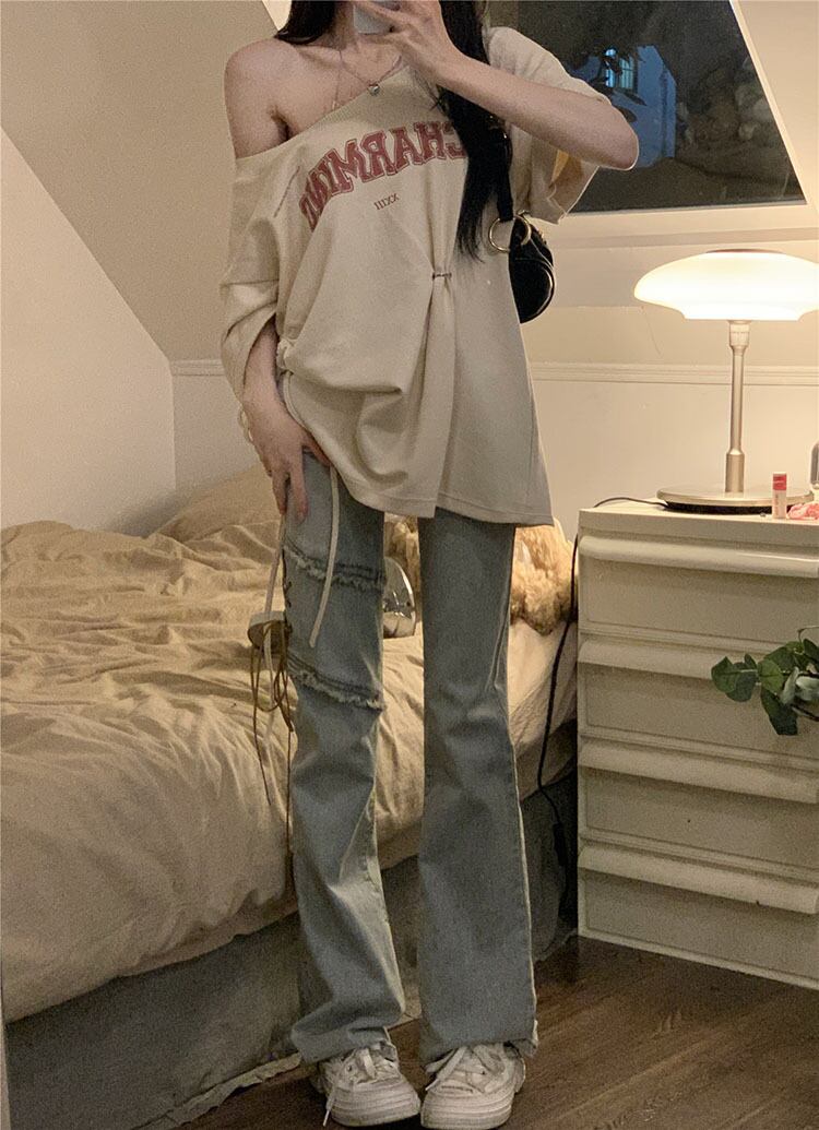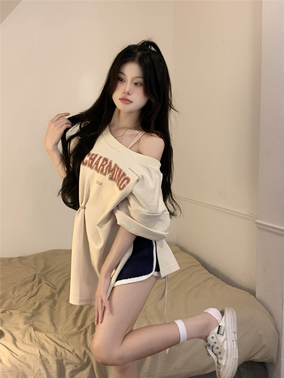 American retro printed half-sleeve T-shirt women's summer 2022 new off-the-shoulder strappy hollow loose top trendy レトロ プリント サマー 夏物 Tシャツ 0921943457989099