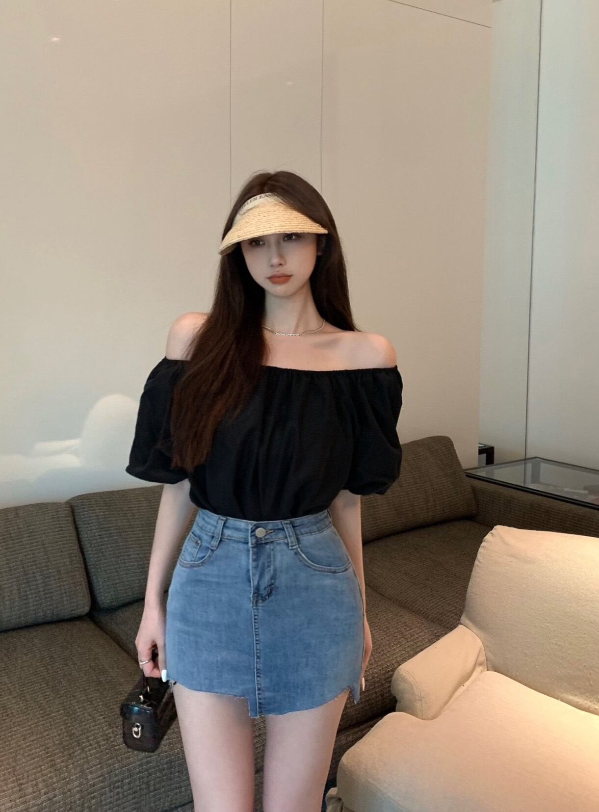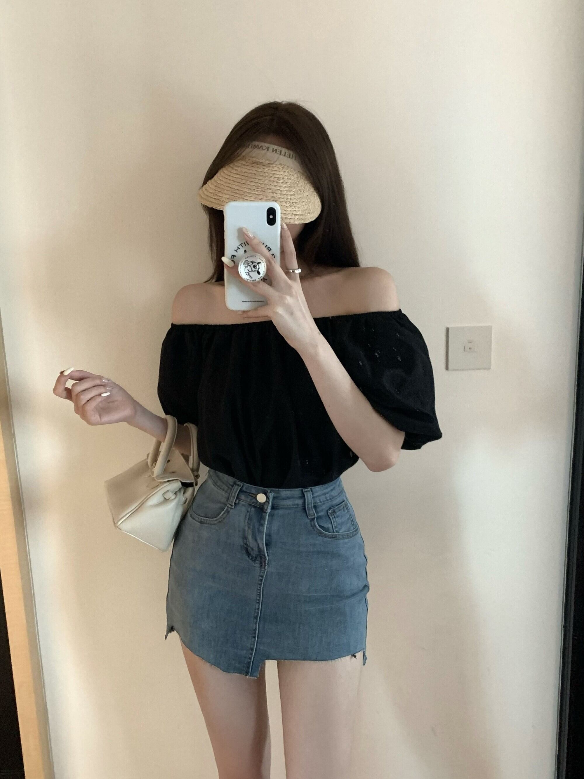 -quality black short-sleeved shirt women's summer 2022 new French style all-match loose one-shoulder top trendy ブラック サマー 夏物 0921963642127284