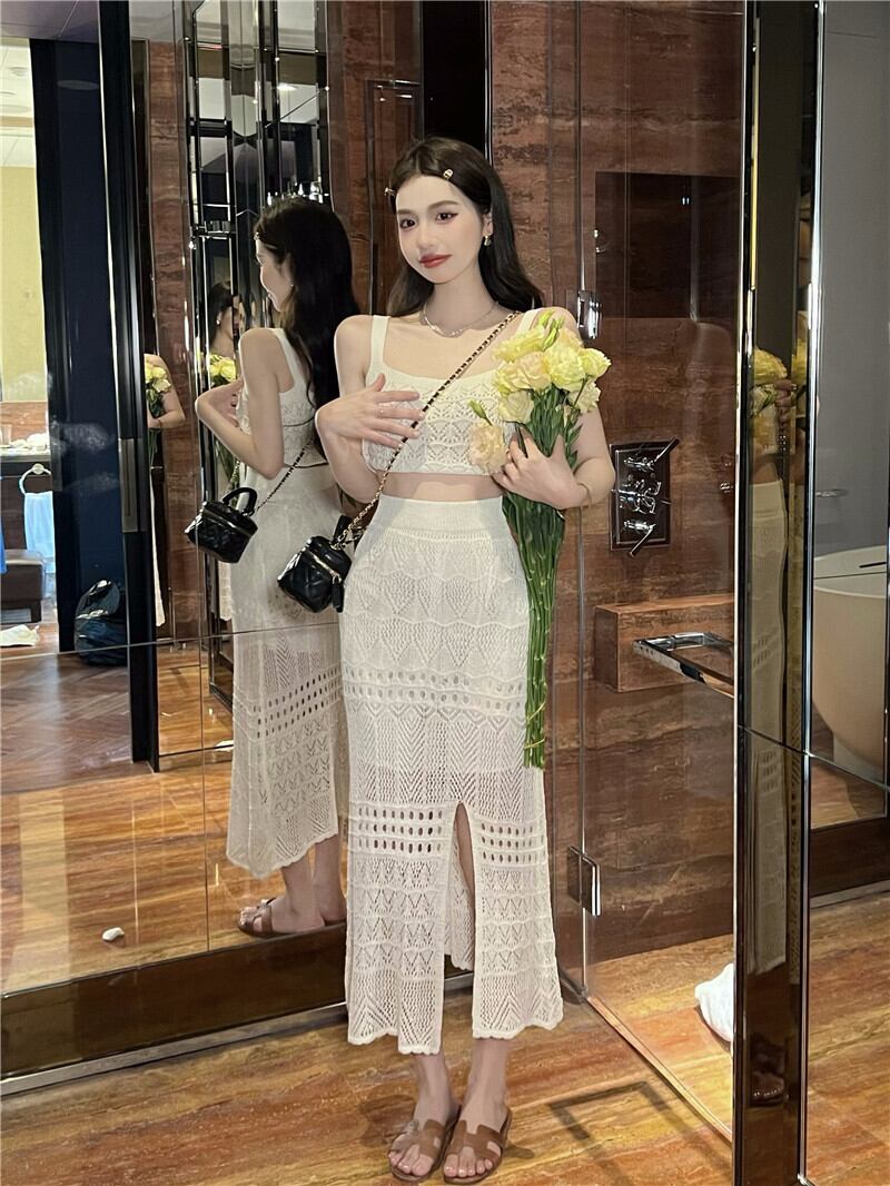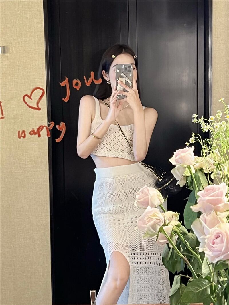 Royal sister style white knitted suit female summer 2022 new hollow vest split half skirt pure desire two-piece set ホワイト サマー 夏物 スカート ピュア 0921960495865503