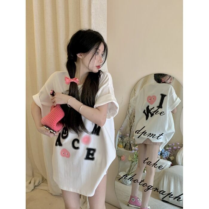 Lazy wind love letter print embroidered short-sleeved T-shirt women's summer new oversize mid-length top trendy レッド 刺繍 サマー 夏物 Tシャツ 0921937962575836