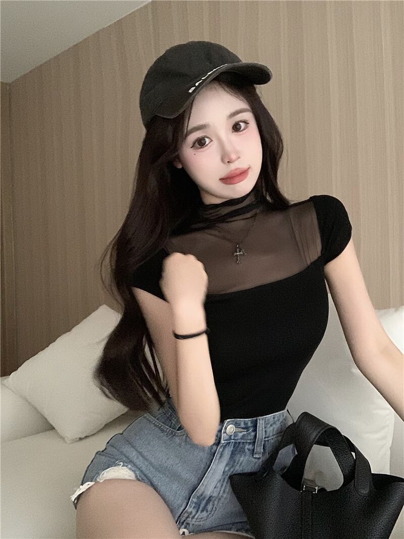 sense stitching mesh half turtleneck short-sleeved T-shirt women's summer 2022 new slim fit black top trendy ブラック サマー 夏物 メッシュ スリム Tシャツ ステッチ 0921945049414376