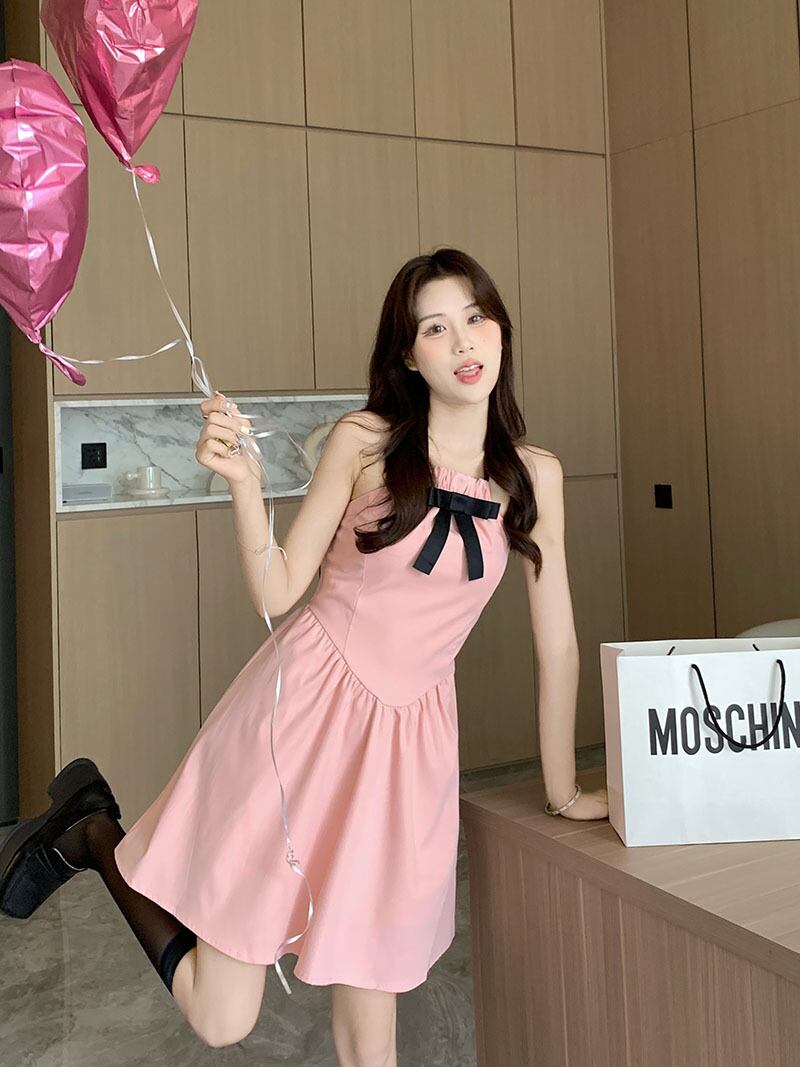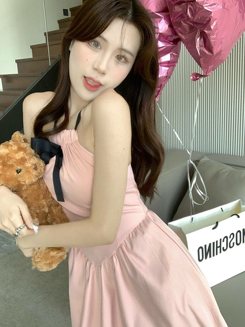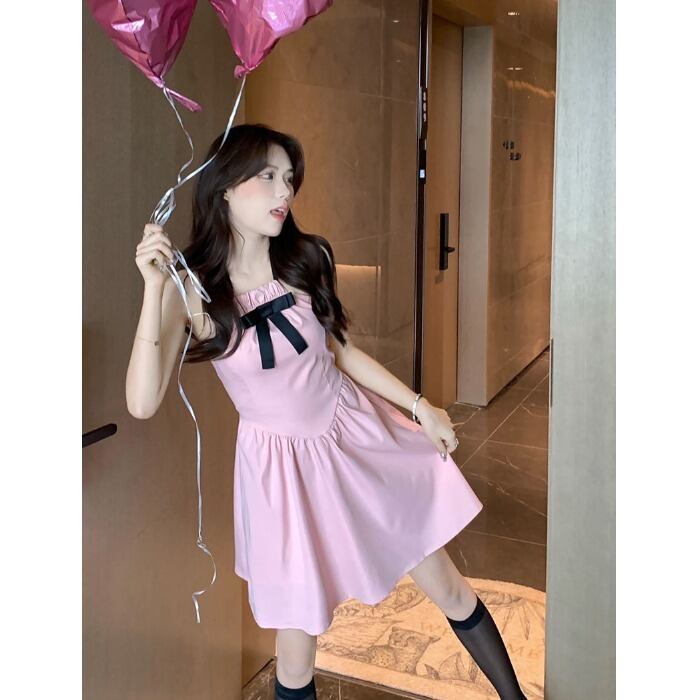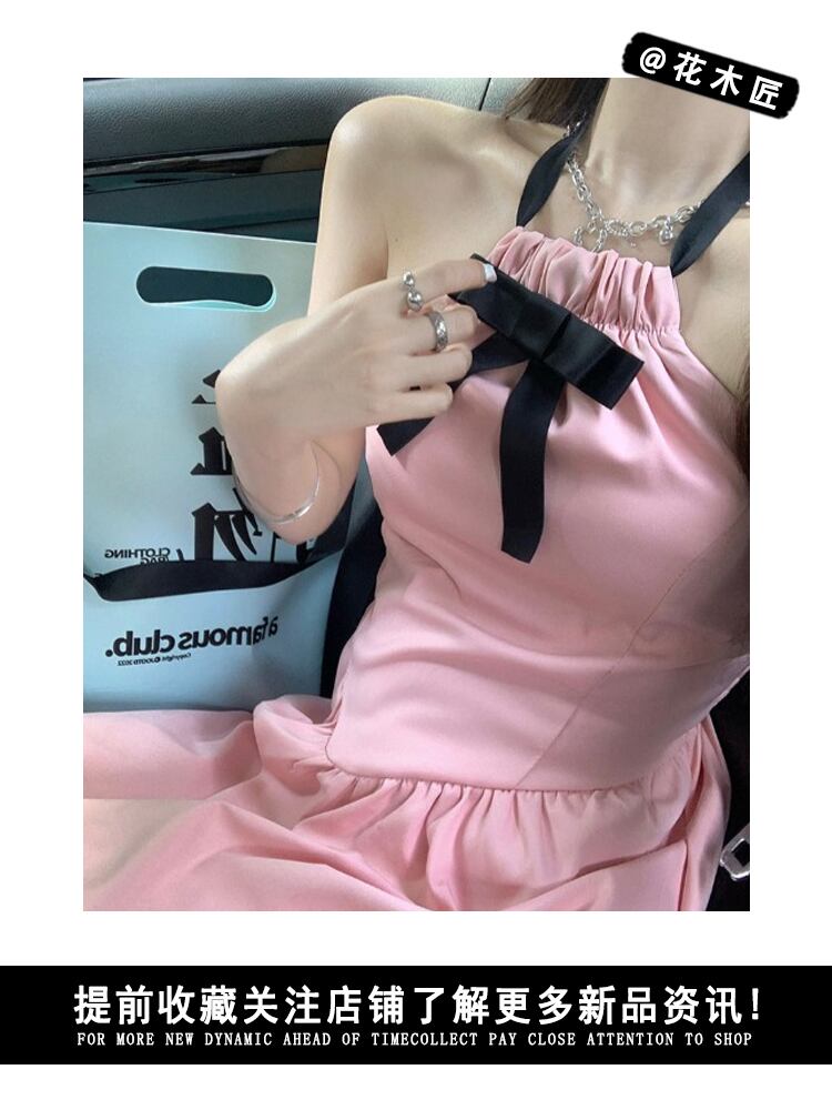 Sweet and spicy bow pink halter dress women's summer 2022 new small pleated waist A-line skirt ピンク リボン 大人ガーリー スウィート キュート カジュアル プリーツ サマー 夏物 スカート Aライン 0921993533195259
