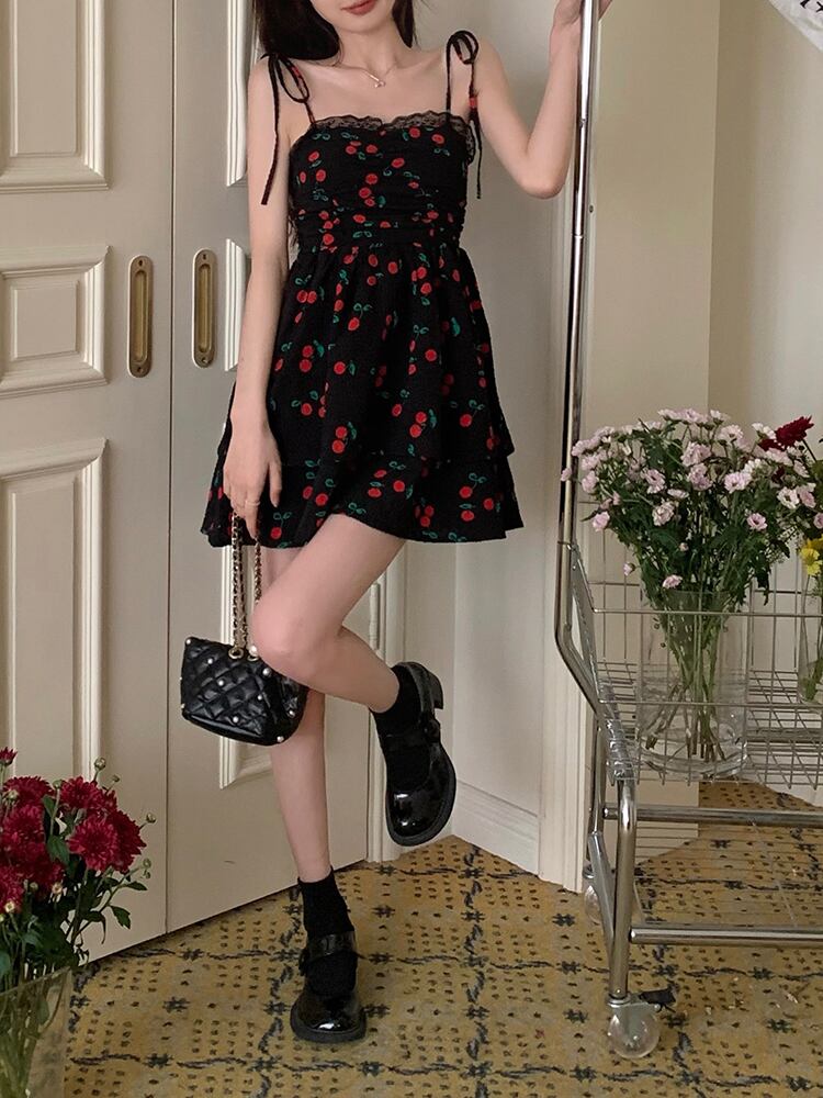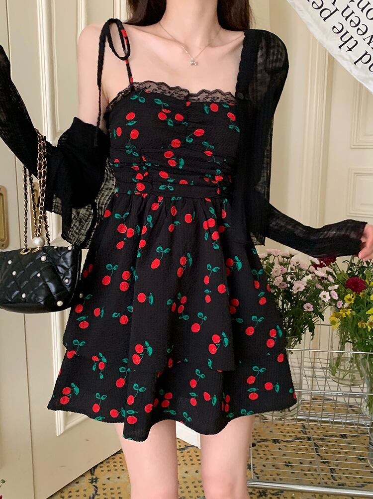 Pure desire wind lace edge pleated cherry suspender dress female summer 2022 new temperament waist cake short skirt ショート レース プリーツ サマー 夏物 スカート 0921963890075018