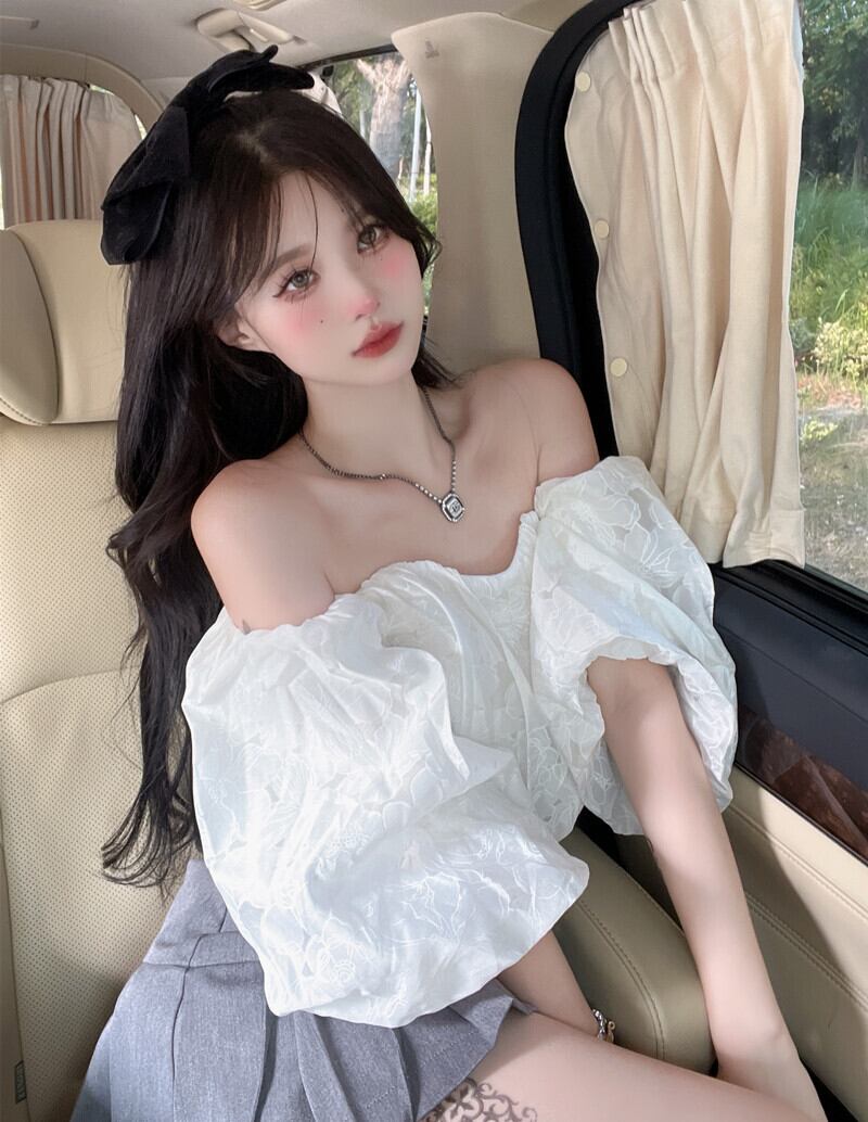 Hot white one-shoulder top women's summer 2022 new design slim pleated short puff sleeve shirt ショート ホワイト プリーツ サマー 夏物 スリム 0921989731336458