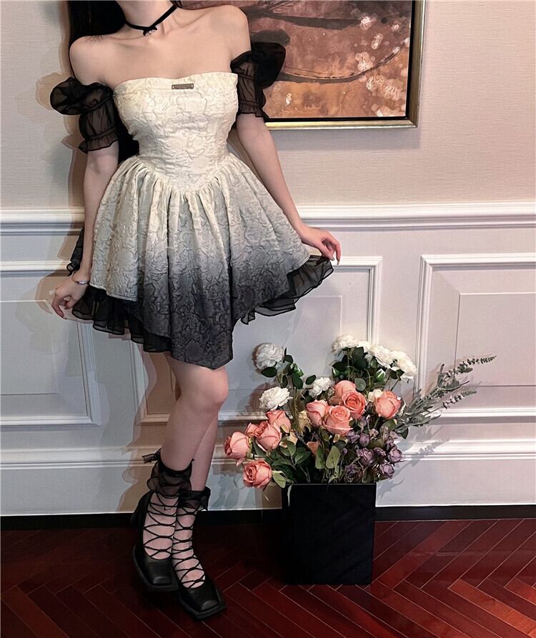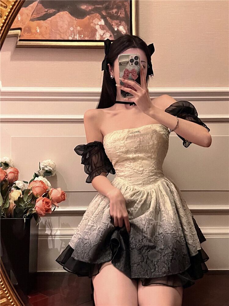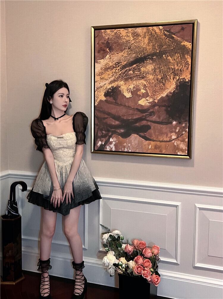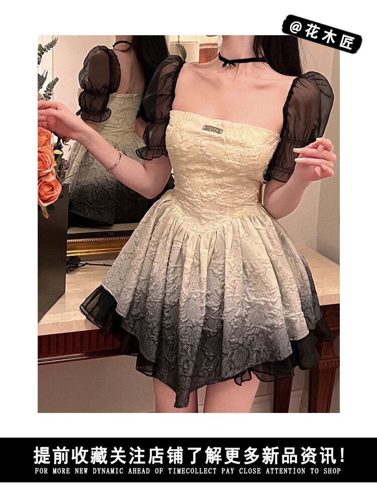 French puff sleeve gradient dress female summer 2022 new temperament square neck pleated waist puffy skirt trendy プリーツ サマー 夏物 スカート スクウェア 0921990060149076