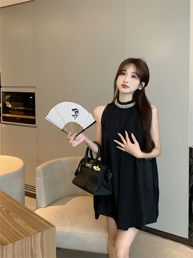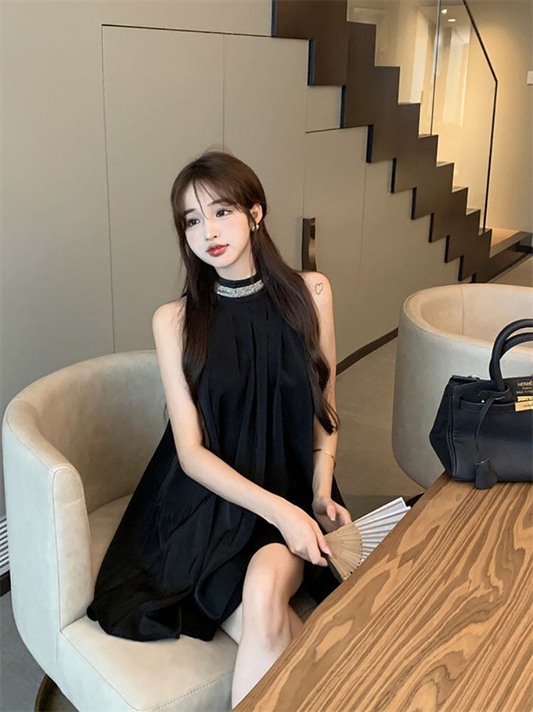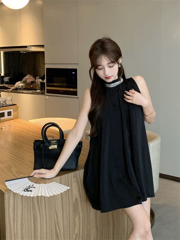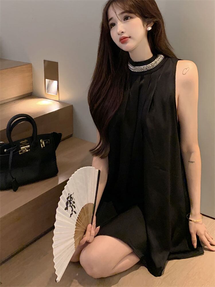Black heavy industry satin vest dress women's summer 2022 new small pleated loose and thin A-line skirt ブラック プリーツ サマー 夏物 スカート Aライン サテン 0921978363437764