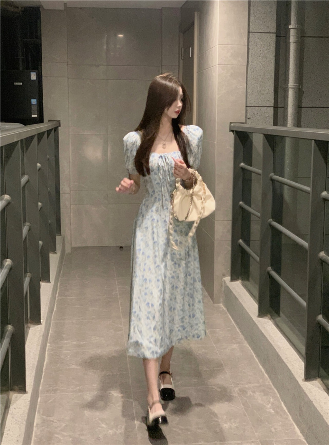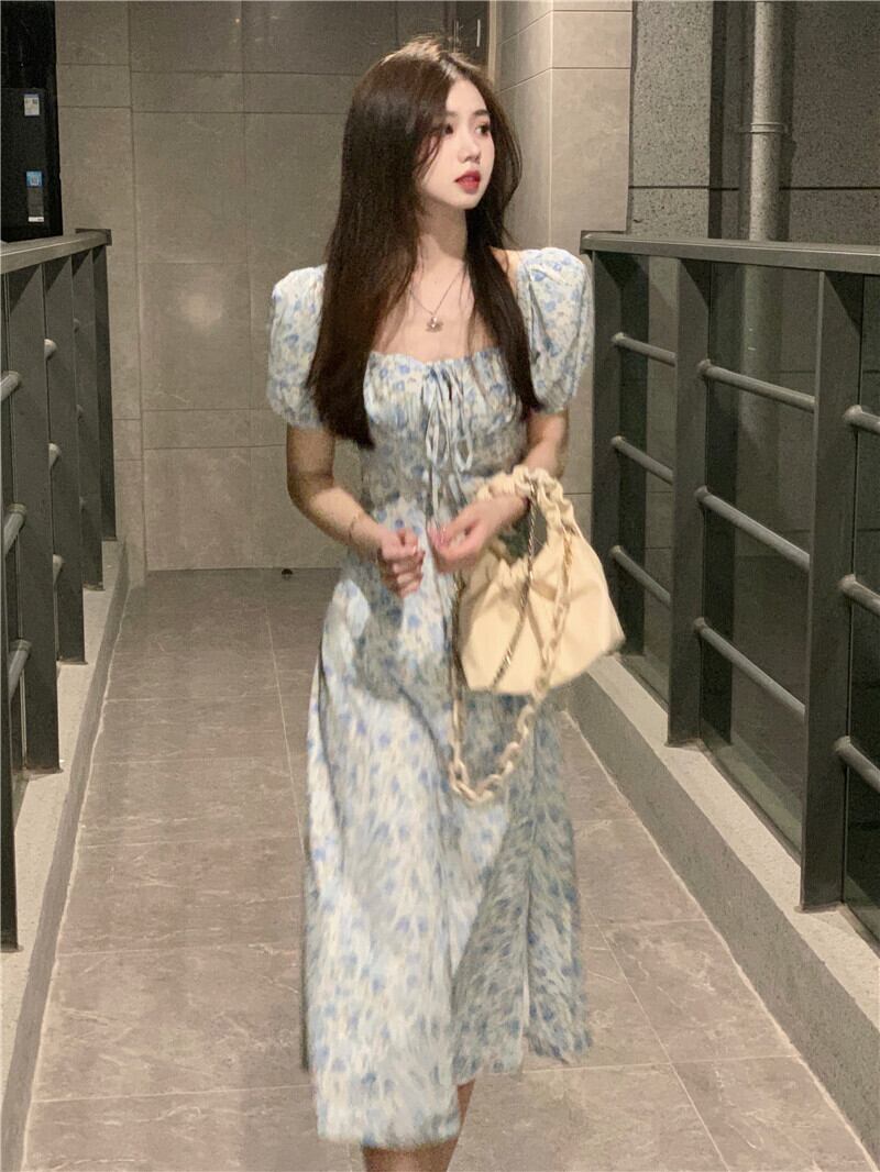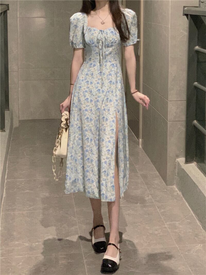 French romantic floral dress women's summer 2022 new lace-up square neck waist mid-length slit a-line skirt レース サマー 夏物 花柄 スカート Aライン レースアップ スクウェア 0921963759252847