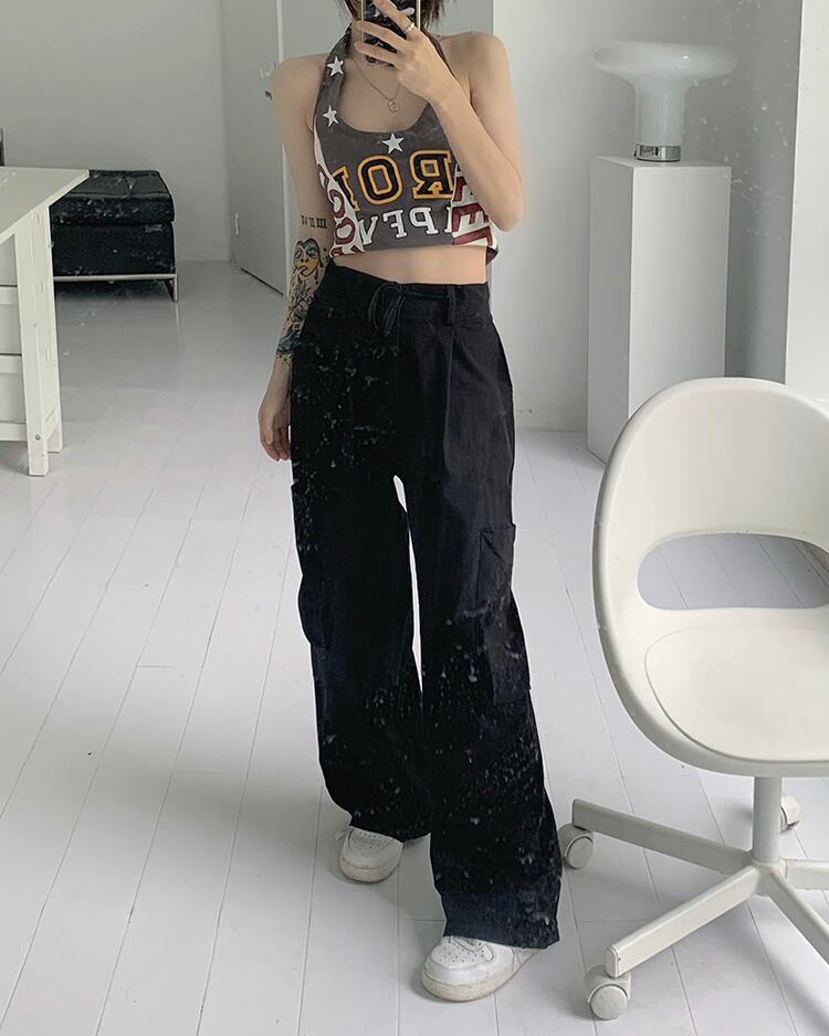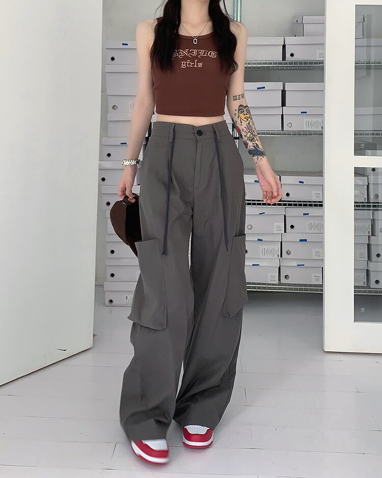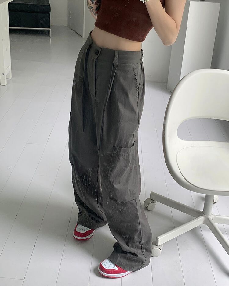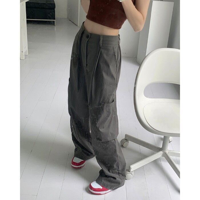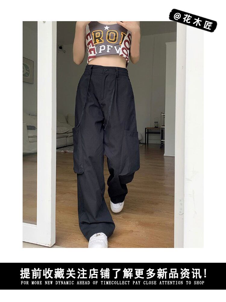Retro chic fried street high waist overalls casual pants women's summer 2022 new design drawstring thin wide-leg pants ハイウェスト レトロ カジュアル ストリート サマー 夏物 0921948852516782