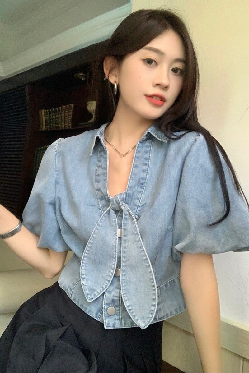 sense niche polo collar puff sleeve denim shirt women's summer 2022 new temperament thin short top ショート サマー 夏物 0921979358060657