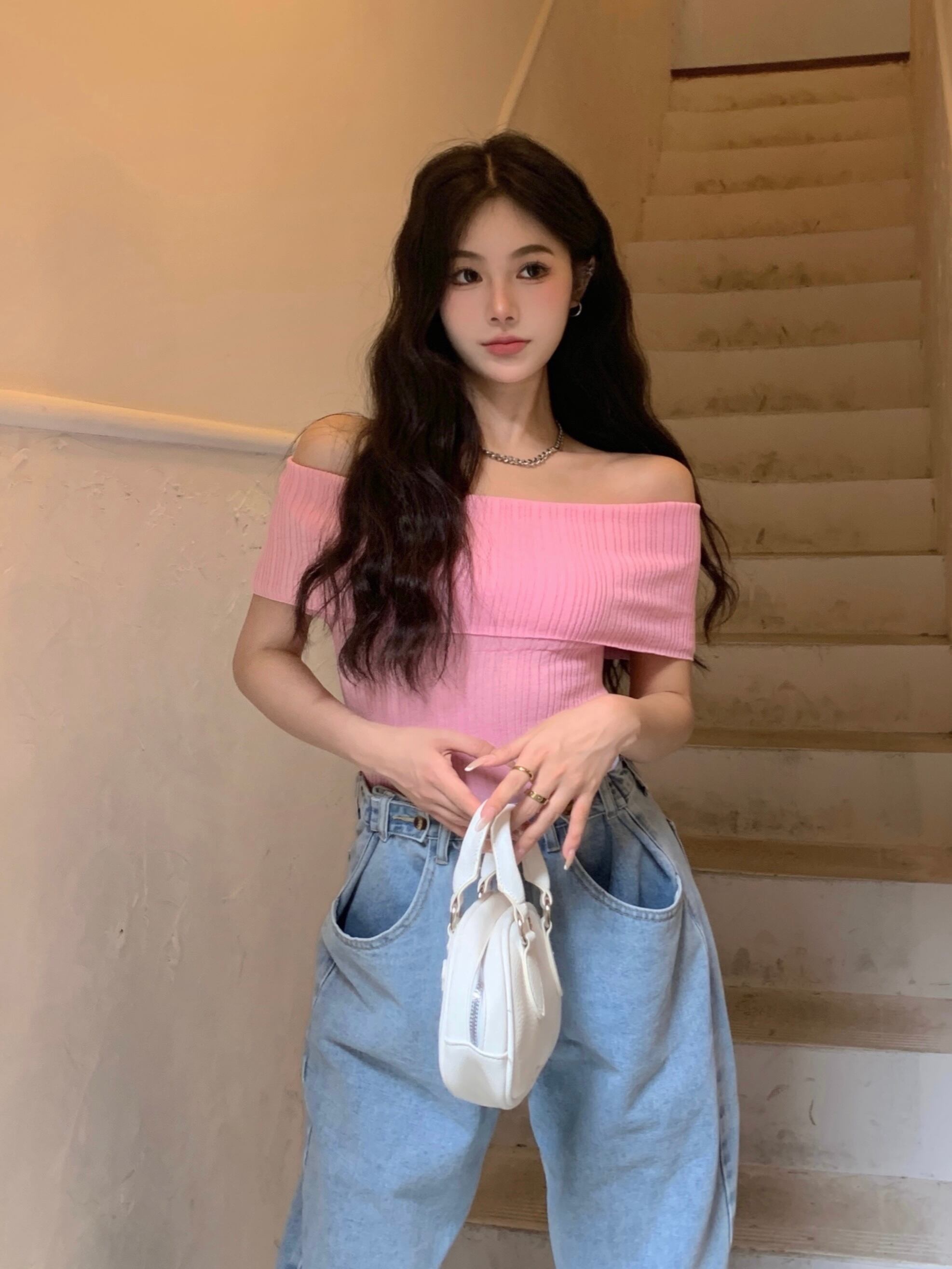 French retro one-shoulder black short-sleeved T-shirt women's summer 2022 new temperament all-match slim short top ショート ブラック レトロ サマー 夏物 スリム Tシャツ 0921956215893693