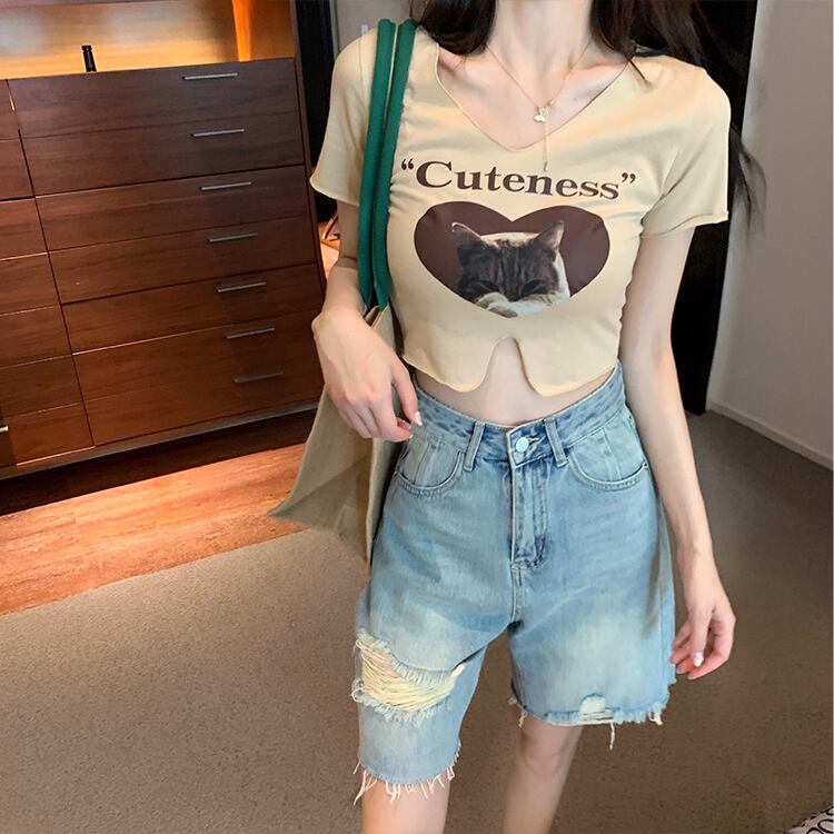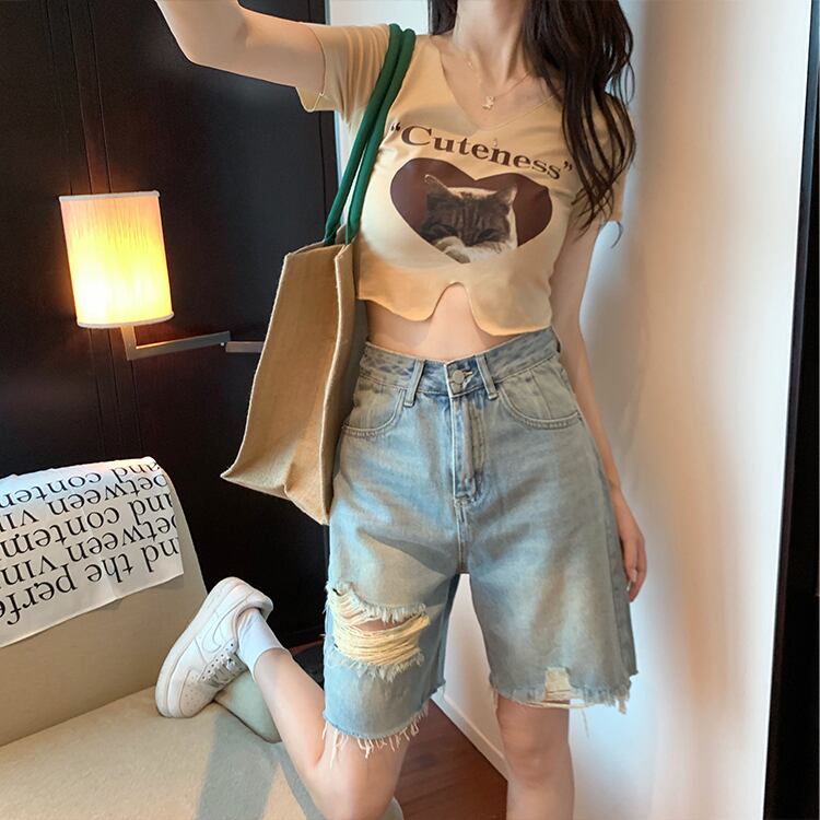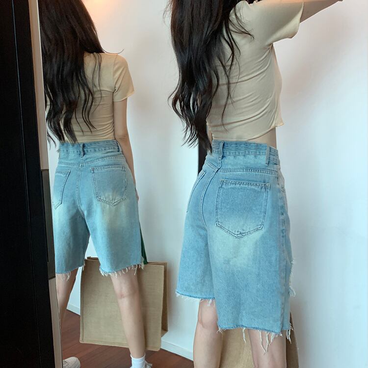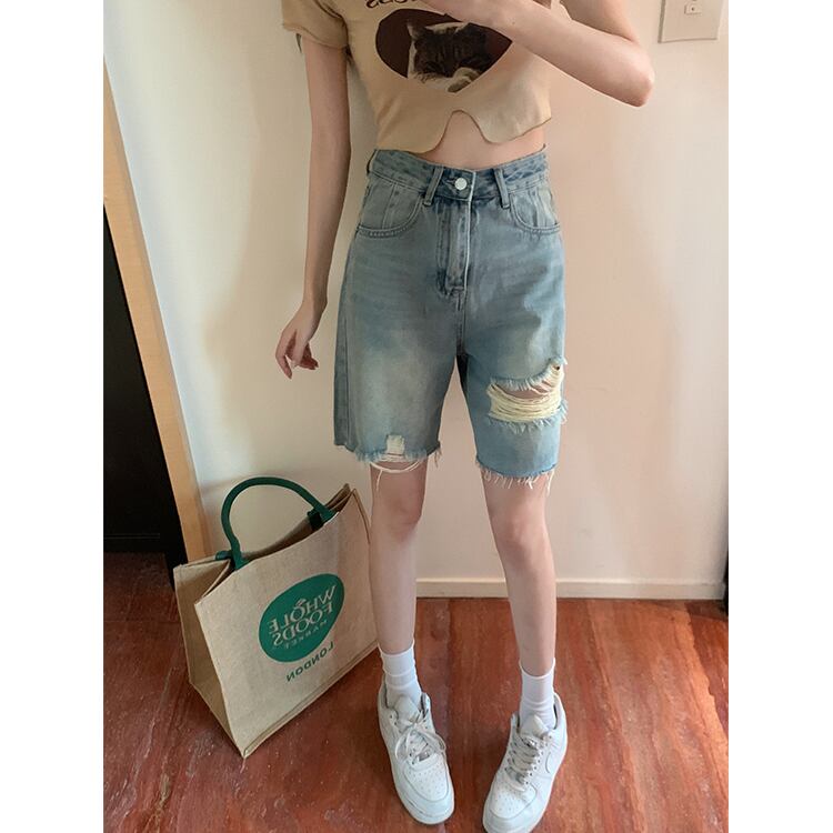 sense ripped denim shorts women's summer 2022 new high-waisted thin loose straight five-point wide-leg pants サマー 夏物 ショーツ ブルマー 0921913509921920