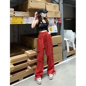 American overalls red casual pants women's summer 2022 new eign style pockets high waist loose wide leg pants ハイウェスト レッド カジュアル サマー 夏物 ワイドレッグ ワイドパンツ 0921984957419248